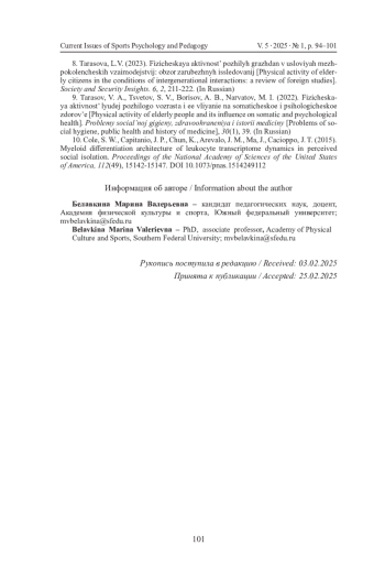 8. Тарасова Л. В. Физическая активность пожилых граждан в условиях межпоколенческих взаимодействий: обзор зарубежных исследований // Society and Security Insights. 2023. Т. 6, № 2. С. 211-222. EDN: BPTWQD