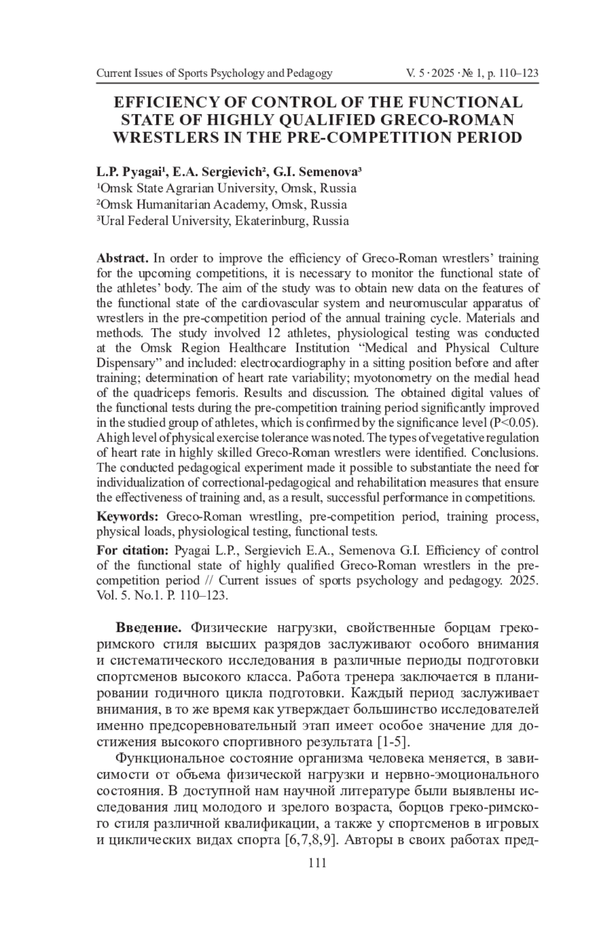 Материалы и методы. В исследовании приняли участие 12 спортсменов, физиологическое тестирование проводилось на базе бюджетного учреждения здравоохранения Омской области «Врачебно-физкультурный диспансер» и включало в себя: электрокардиографию в положении сидя до и после тренировки; определение вариабельности ритма сердца; миотонометрия на медиальной головке четырехглавой мышцы бедра. Результаты исследования и их обсуждение. Полученные цифровые значения функциональных тестов за период предсоревновательной подготовки достоверно улучшились в исследуемой группе спортсменов, что подтверждается уровнем значимости (Р<0,05). Был отмечен высокий уровень переносимости физических нагрузок. Выявлены типы вегетативной регуляции сердечного ритма у высококвалифицированных борцов греко-римского стиля.
