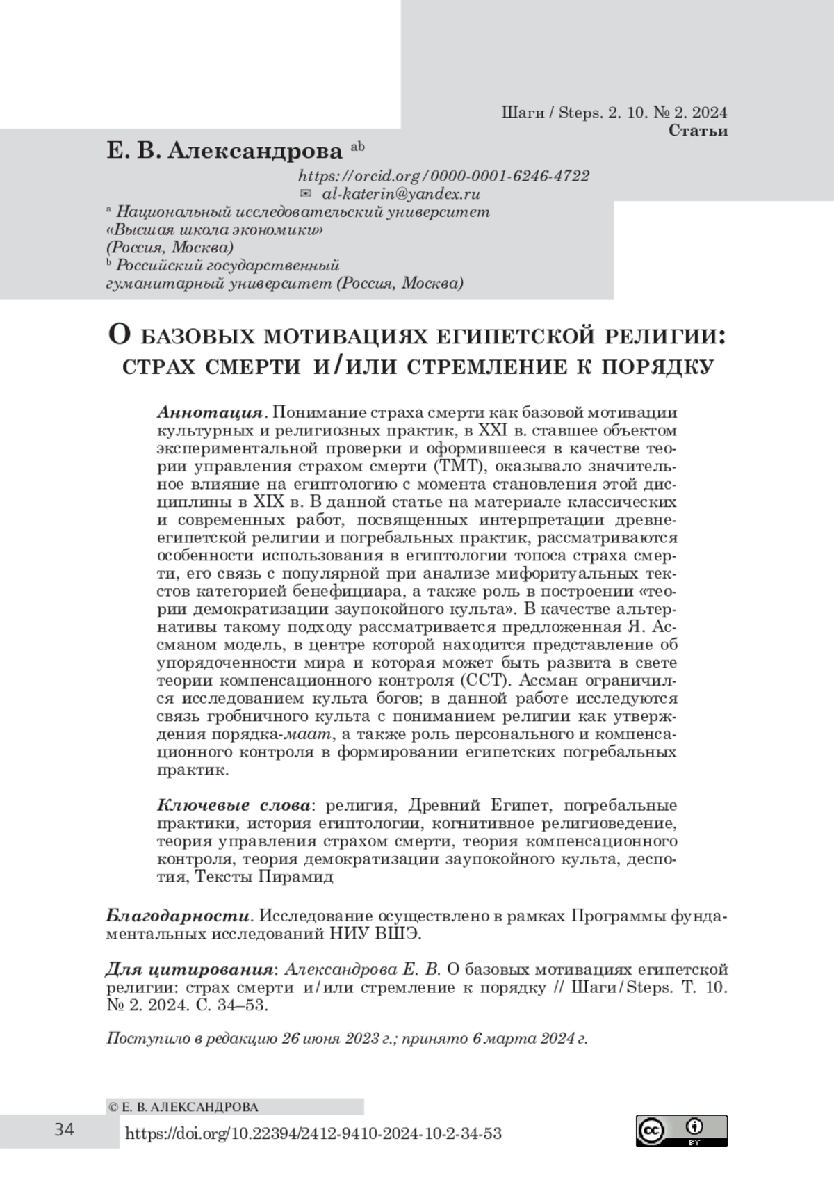 Понимание страха смерти как базовой мотивации культурных и религиозных практик, в XXI в. ставшее объектом экспериментальной проверки и оформившееся в качестве теории управления страхом смерти (TMT), оказывало значительное влияние на египтологию с момента становления этой дисциплины в XIX в. В данной статье на материале классических и современных работ, посвященных интерпретации древнеегипетской религии и погребальных практик, рассматриваются особенности использования в египтологии топоса страха смерти, его связь с популярной при анализе мифоритуальных текстов категорией бенефициара, а также роль в построении «теории демократизации заупокойного культа». В качестве альтернативы такому подходу рассматривается предложенная Я. Ассманом модель, в центре которой находится представление об упорядоченности мира и которая может быть развита в свете теории компенсационного контроля (CCT). Ассман ограничился исследованием культа богов; в данной работе исследуются связь гробничного культа с пониманием религии как утверждения порядка-маат, а также роль персонального и компенсационного контроля в формировании египетских погребальных практик.