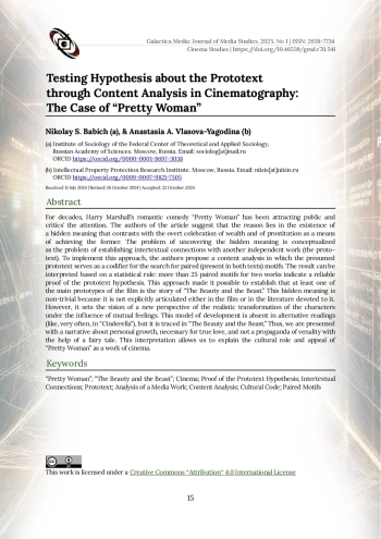 For decades, Harry Marshall’s romantic comedy “Pretty Woman” has been attracting public and critics’ the attention. The authors of the article suggest that the reason lies in the existence of a hidden meaning that contrasts with the overt celebration of wealth and of prostitution as a means of achieving the former. The problem of uncovering the hidden meaning is conceptualized as the problem of establishing intertextual connections with another independent work (the prototext). To implement this approach, the authors propose a content analysis in which the presumed prototext serves as a codifier for the search for paired (present in both texts) motifs. The result can be interpreted based on a statistical rule: more than 25 paired motifs for two works indicate a reliable proof of the prototext hypothesis. This approach made it possible to establish that at least one of the main prototypes of the film is the story of “The Beauty and the Beast.” This hidden meaning is non-trivial because it is not explicitly articulated either in the film or in the literature devoted to it. However, it sets the vision of a new perspective of the realistic transformation of the characters under the influence of mutual feelings. This model of development is absent in alternative readings (like, very often, in “Cinderella”), but it is traced in “The Beauty and the Beast.” Thus, we are presented with a narrative about personal growth, necessary for true love, and not a propaganda of venality with the help of a fairy tale. This interpretation allows us to explain the cultural role and appeal of “Pretty Woman” as a work of cinema.