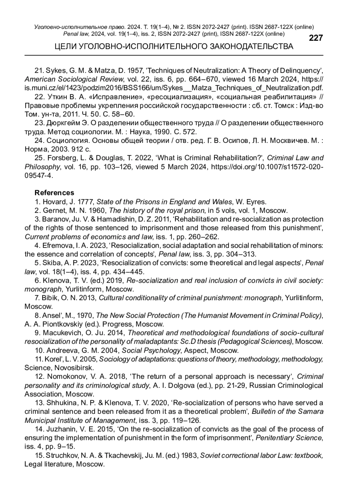 5. Скиба А. П. Ресоциализация осужденных: некоторые теоретико-правовые аспекты // Уголовно-исполнительное право. 2023. Т. 18(1-4), № 4. С. 434-445. EDN: BIVCRJ