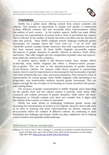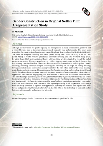 Несмотря на активное движение за равноправие, вопросы, связанные с гендером, остаются актуальными из-за множества проявлений социальной несправедливости. Цель исследования — анализ того, как гендер представлен в глобальных фильмах Netflix, выпущенных в 2021–2022 годах. В выборку вошли: «Королевство: Ашин из Севера» (Южная Корея), «Не смотрите наверх» (США), «Я — все девушки» (Южная Африка), «Мир без мужчин» (Индонезия), «Сантинель» (Франция) и «Уикенд вдали» (США). Исследование основано на теории репрезентации Стюарта Холла, которая рассматривает язык как ключевой инструмент для интерпретации культурных смыслов. Анализ проводится в три этапа: декодирование, кодирование и мифологический разбор. Декодирование и кодирование позволяют определить значения через анализ денотаций и коннотаций, представленных в фильмах. Мифологический подход помогает выявить более глубокие культурные контексты. Результаты показывают, что оригинальные фильмы Netflix демонстрируют схожие паттерны: изображают борьбу женщин с угнетением и несправедливостью, освещают дискриминацию по расовым и социальным признакам, утверждают перформативность гендера и ставят под сомнение патриархальные нормы. Тем не менее, некоторые картины непреднамеренно укрепляют стереотипы или предлагают поверхностные интерпретации, особенно в отношении традиционных представлений о мужественности. Патриархальные установки сохраняют своё влияние, несмотря на обсуждаемые в фильмах проблемы неравенства и угнетения. Более того, героини часто воспроизводят эти установки, что связано с противоречием между стремлением к равенству и коммерческими интересами.