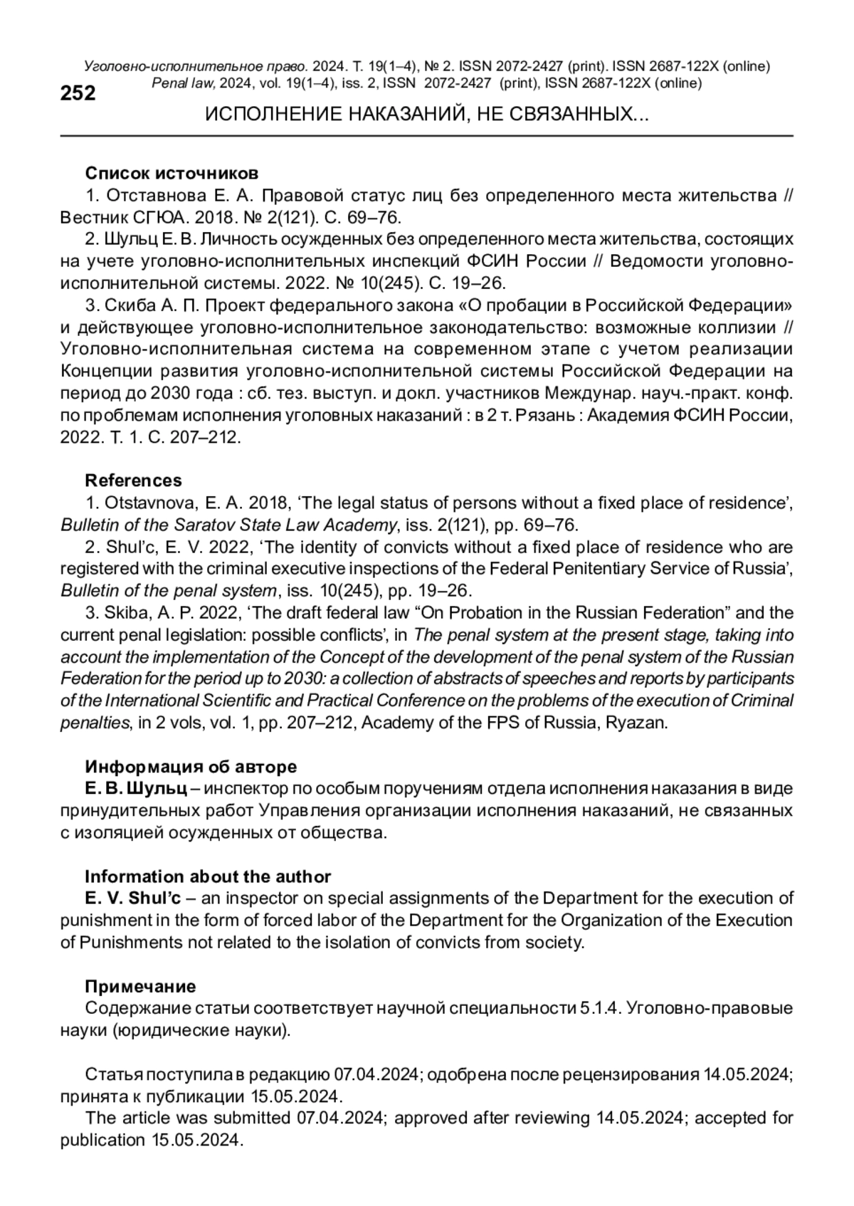2. Шульц Е. В. Личность осужденных без определенного места жительства, состоящих на учете уголовно-исполнительных инспекций ФСИН России // Ведомости уголовноисполнительной системы. 2022. № 10(245). С. 19-26. EDN: TDAKIE