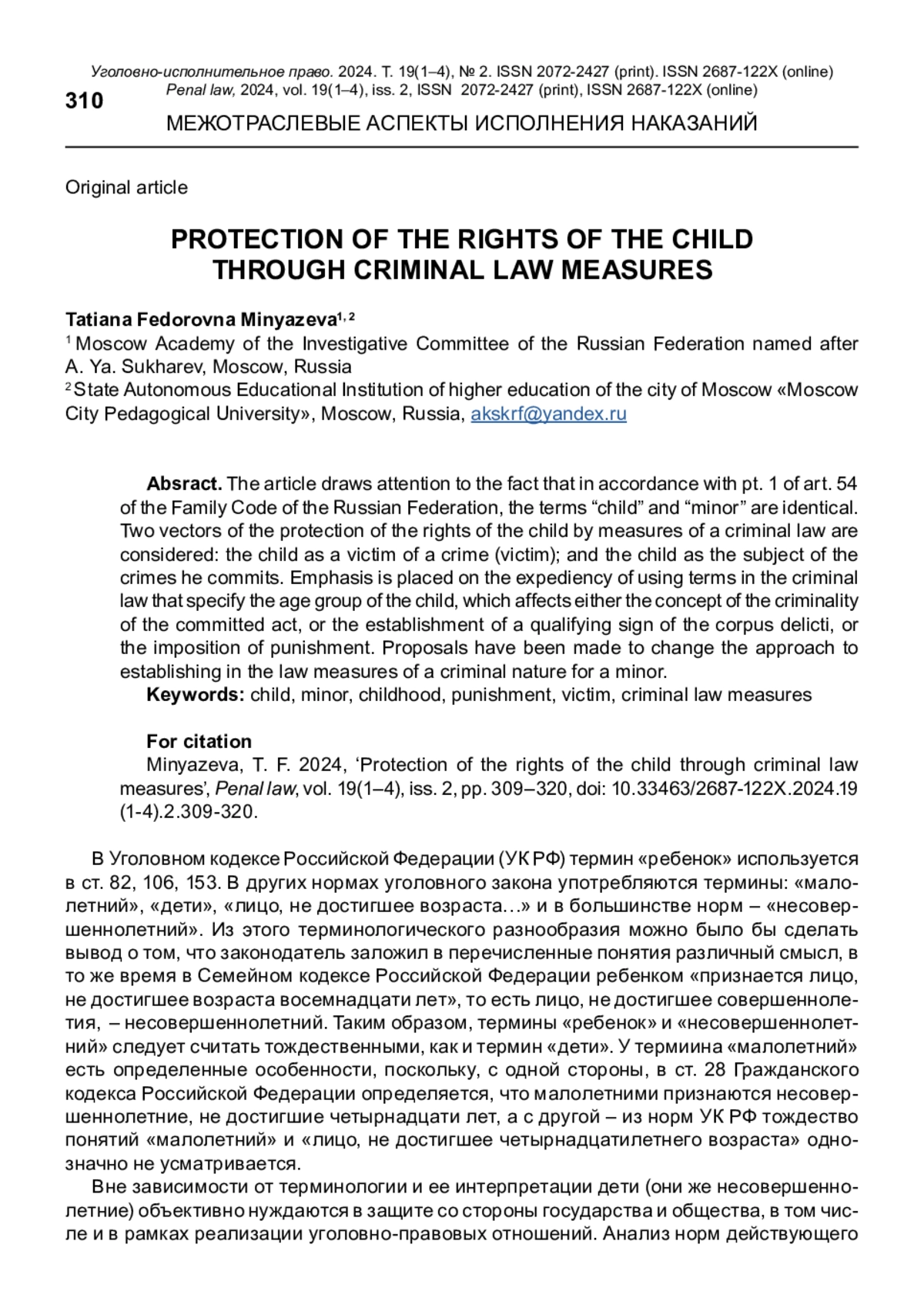 В статье обращено внимание на то, что в соответствии с частью 1 статьи 54 Семейного кодекса Российской Федерации термины «ребенок» и «несовершеннолетний» идентичны. Рассмотрены два вектора охраны прав ребенка мерами уголовно-правового характера: ребенок как жертва преступления (потерпевший) и ребенок как субъект совершаемых им преступлений. Сделан акцент на целесообразность употребления в уголовном законе терминов, уточняющих возрастную группу ребенка, влияющую либо на понятие преступности совершенного деяния, либо на установление квалифицирующего признака состава преступления, либо на назначение наказания. Внесены предложения об изменении подхода к установлению в законе мер уголовно-правового характера несовершеннолетнему.