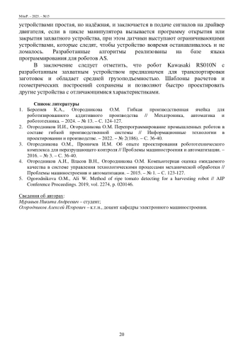 1. Берсенев К.А., Огородникова О.М. Гибкая производственная ячейка для роботизированного аддитивного производства // Мехатроника, автоматика и робототехника. – 2024. – № 13. – С. 124-127.