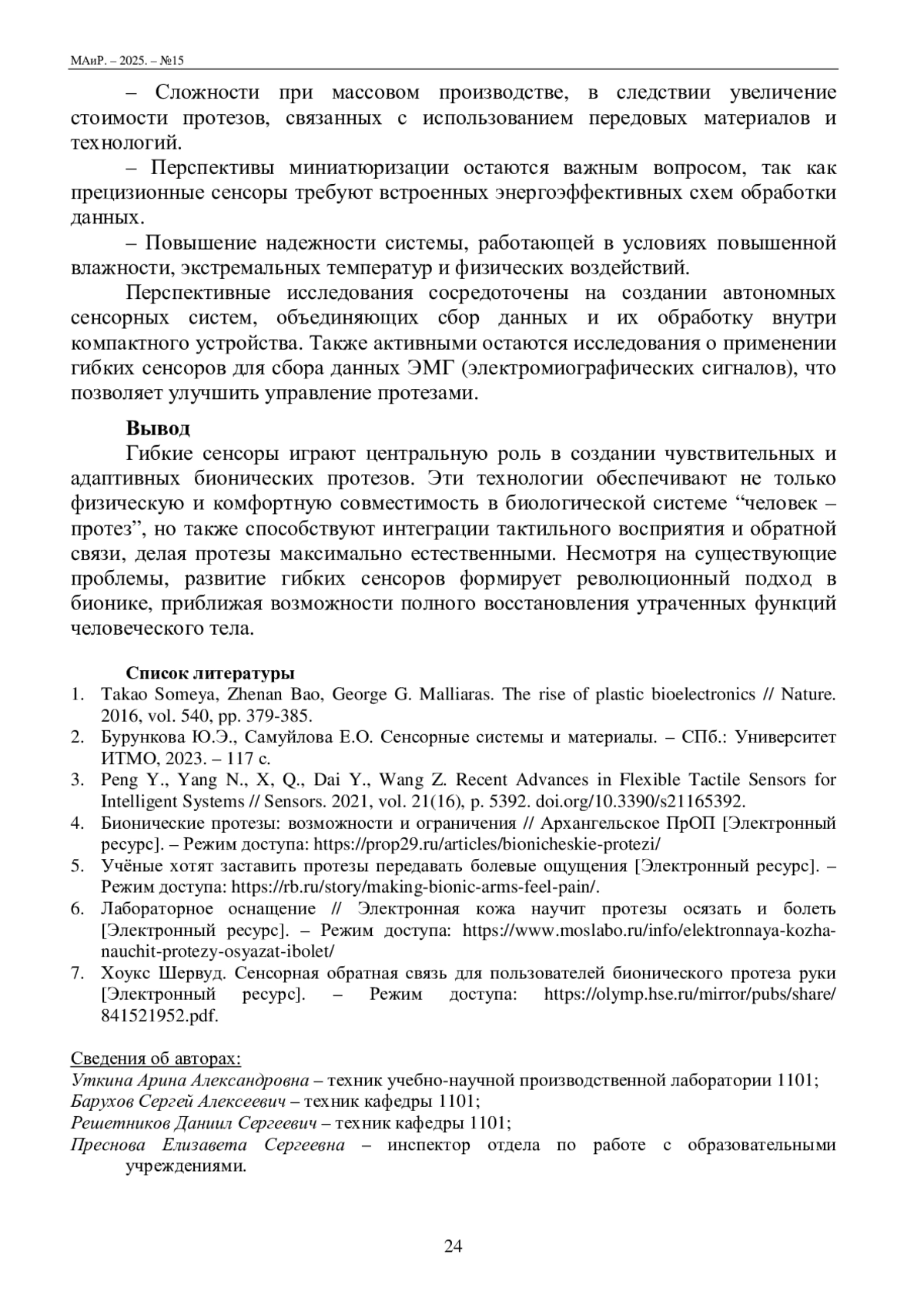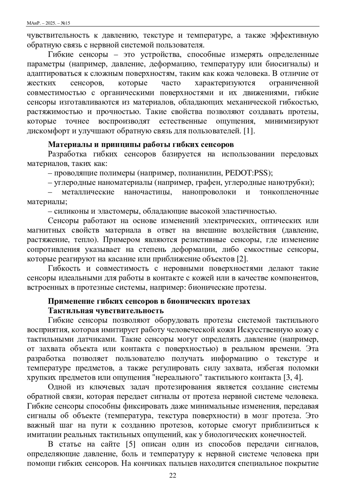 3. Peng Y., Yang N., X, Q., Dai Y., Wang Z. Recent Advances in Flexible Tactile Sensors for Intelligent Systems // Sensors. 2021, vol. 21(16), p. 5392. doi.org/10.3390/s21165392.