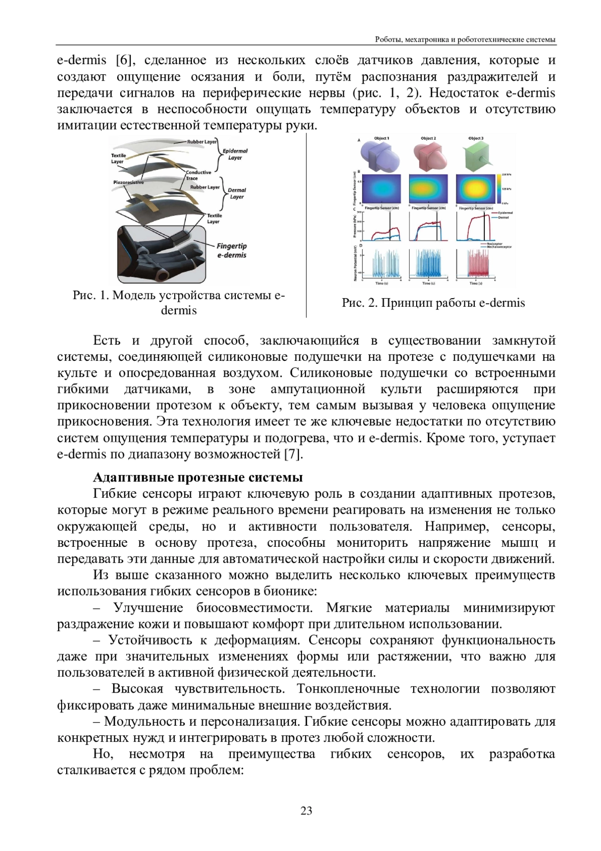 В данной статье будут рассмотрены гибкие сенсоры: принцип работы, возможности применения в бионических протезах. Приведены материалы, используемые при создании датчиков, также освещается тема, связанная с тактильной чувствительностью на примере специального покрытия e-dermis. Рассматривается применение адаптивных протезных систем их преимущества и проблемы, возникающие при их разработке.
