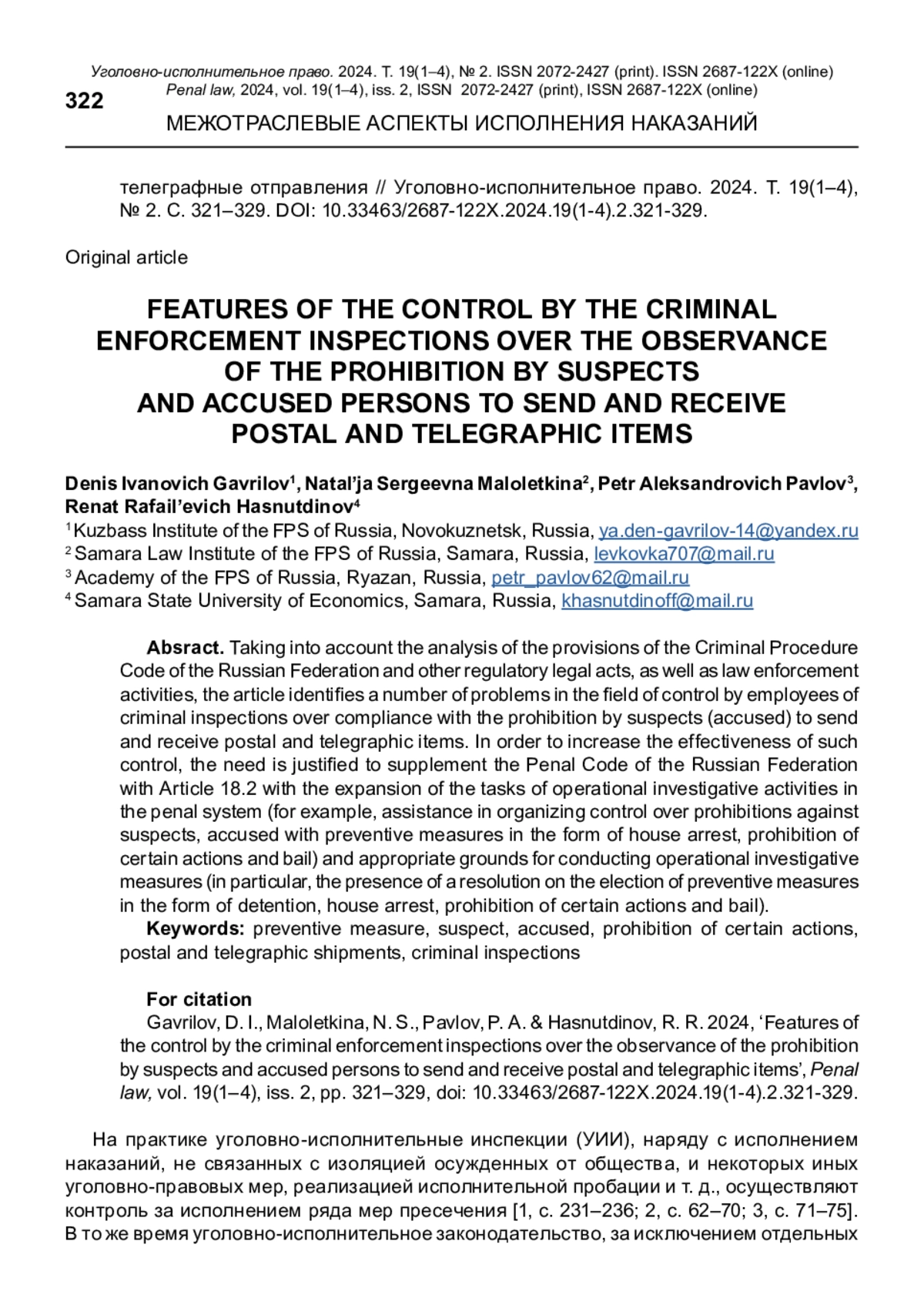 В статье с учетом анализа положений Уголовно-процессуального кодекса Российской Федерации и иных нормативных правовых актов, а также правоприменительной деятельности выявляется ряд проблем в области осуществления контроля со стороны сотрудников уголовно-исполнительных инспекций за соблюдением запрета подозреваемыми (обвиняемыми) отправлять и получать почтово-телеграфные отправления. Для повышения эффективности такого контроля обосновывается необходимость дополнить Уголовно-исполнительный кодекс Российской Федерации статьей 18.2 с расширением задач оперативно-розыскной деятельности в уголовно-исполнительной системе (например, содействие в организации контроля за запретами в отношении подозреваемых, обвиняемых с мерами пресечения в виде домашнего ареста, запрета определенных действий и залога) и соответствующих оснований для проведения оперативно-розыскных мероприятий (в частности, наличие постановления об избрании мер пресечения в виде заключения под стражу, домашнего ареста, запрета определенных действий и залога).