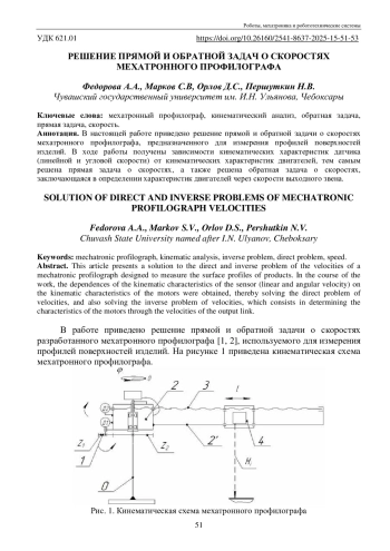 В работе приведено решение прямой и обратной задачи о скоростях разработанного мехатронного профилографа [1, 2], используемого для измерения профилей поверхностей изделий. На рисунке 1 приведена кинематическая схема мехатронного профилографа.