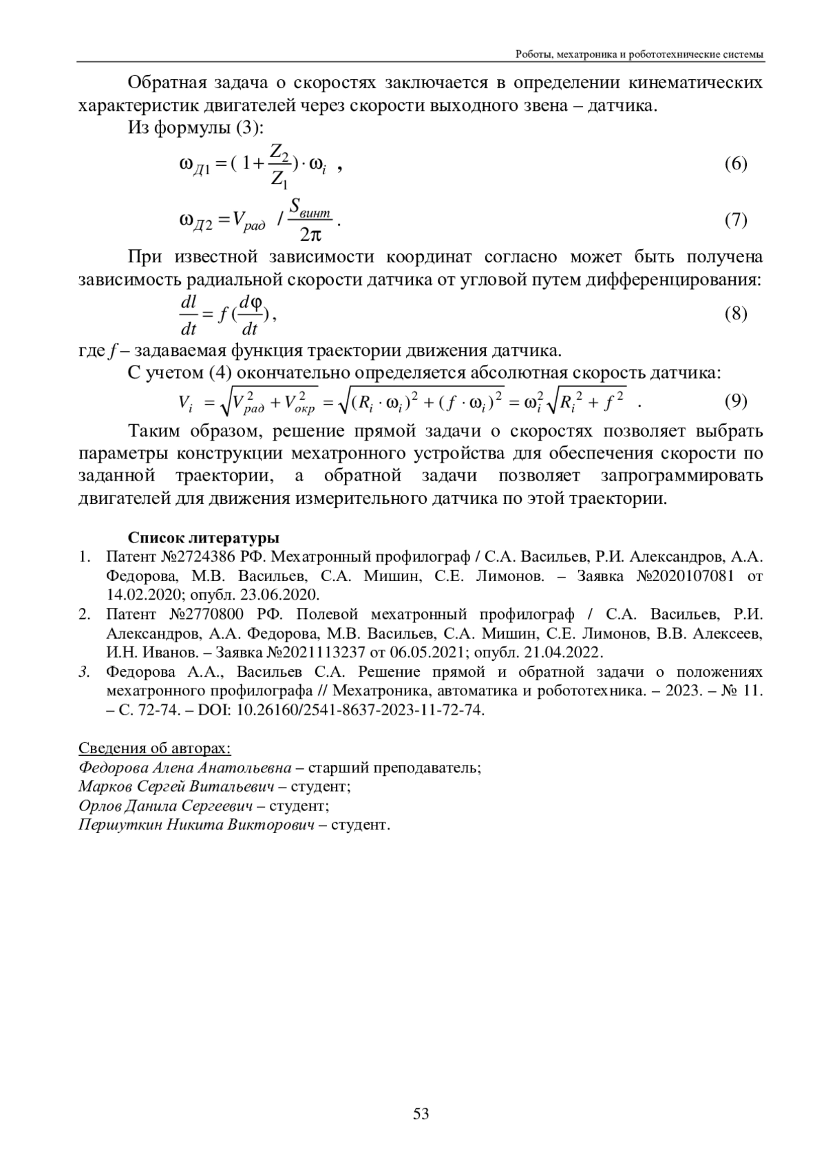 3. Федорова А.А., Васильев С.А. Решение прямой и обратной задачи о положениях мехатронного профилографа // Мехатроника, автоматика и робототехника. – 2023. – № 11. – С. 72-74. – DOI: 10.26160/2541-8637-2023-11-72-74.