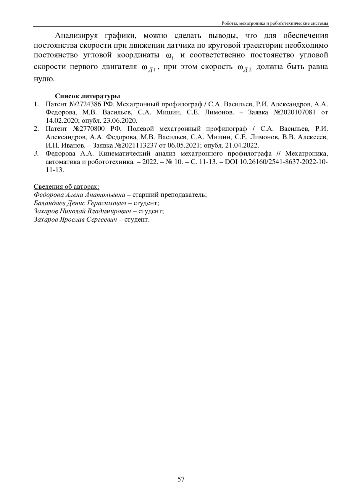 3. Федорова А.А. Кинематический анализ мехатронного профилографа // Мехатроника, автоматика и робототехника. – 2022. – № 10. – С. 11-13. – DOI 10.26160/2541-8637-2022-10- 11-13.