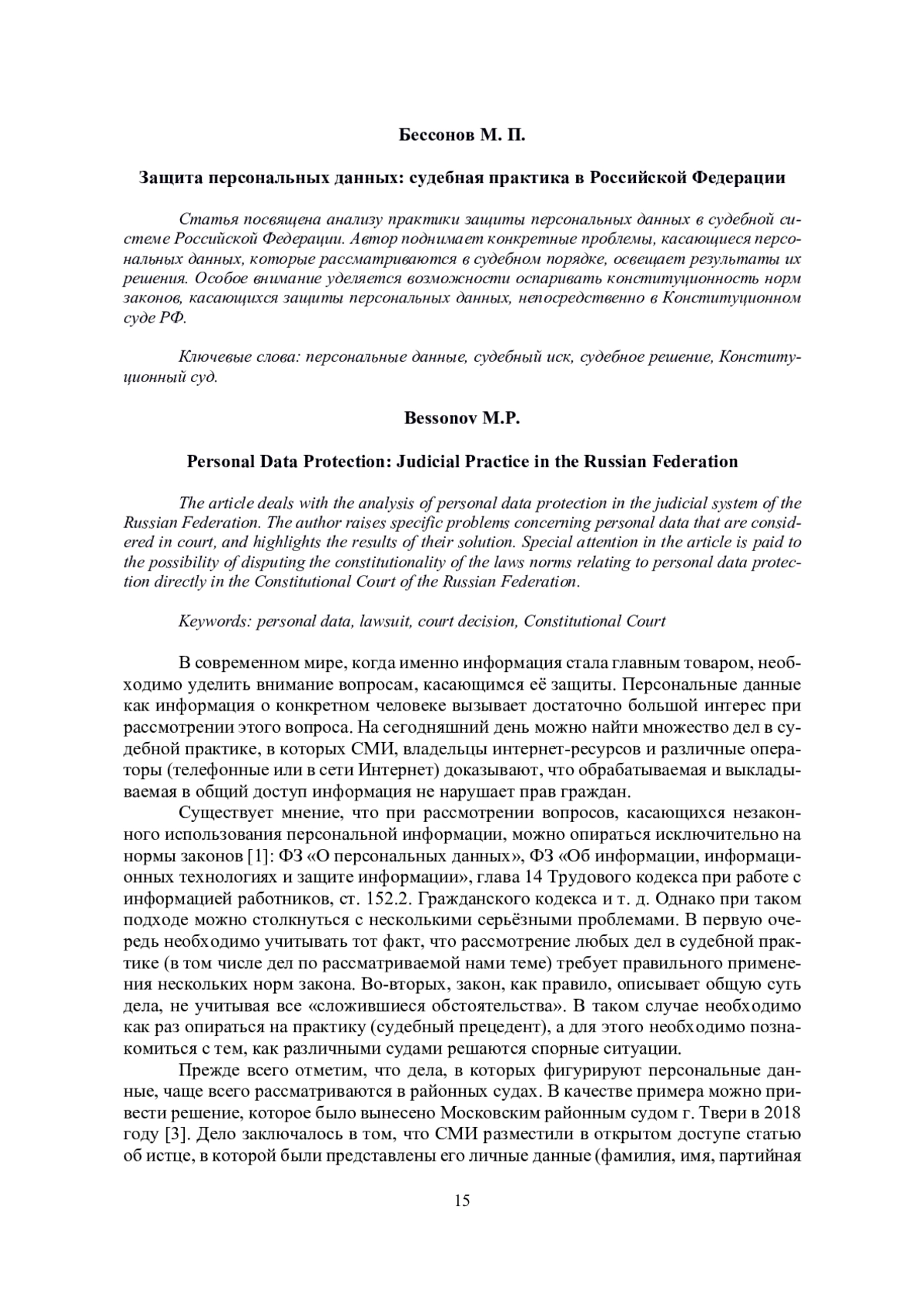Статья посвящена анализу практики защиты персональных данных в судебной системе Российской Федерации. Автор поднимает конкретные проблемы, касающиеся персональных данных, которые рассматриваются в судебном порядке, освещает результаты их решения. Особое внимание уделяется возможности оспаривать конституционность норм законов, касающихся защиты персональных данных, непосредственно в Конституционном суде РФ.