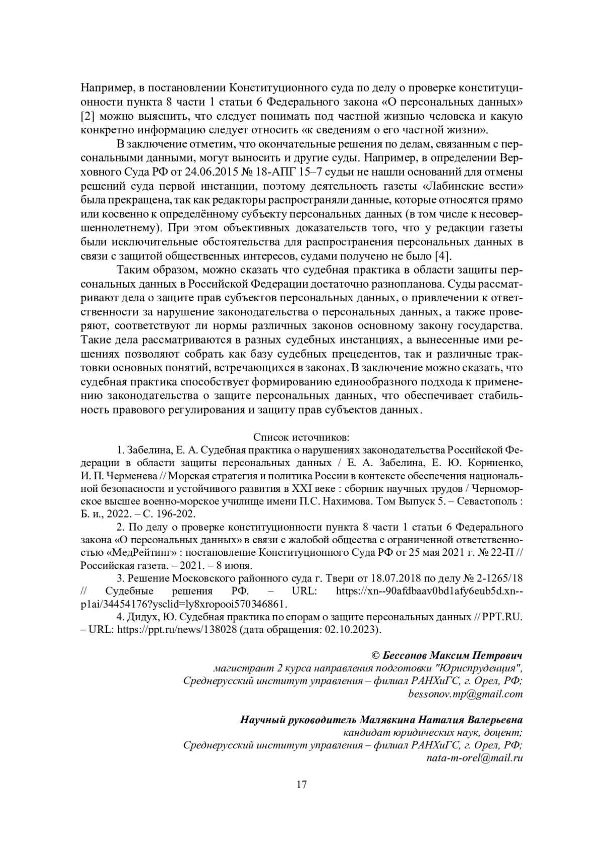 1. Забелина, Е. А. Судебная практика о нарушениях законодательства Российской Федерации в области защиты персональных данных / Е. А. Забелина, Е. Ю. Корниенко, И. П. Черменева // Морская стратегия и политика России в контексте обеспечения национальной безопасности и устойчивого развития в ХХI веке: сборник научных трудов / Черноморское высшее военно-морское училище имени П.С. Нахимова. Том Выпуск 5. - Севастополь: Б. и., 2022. - С. 196-202. EDN: AQIMRV