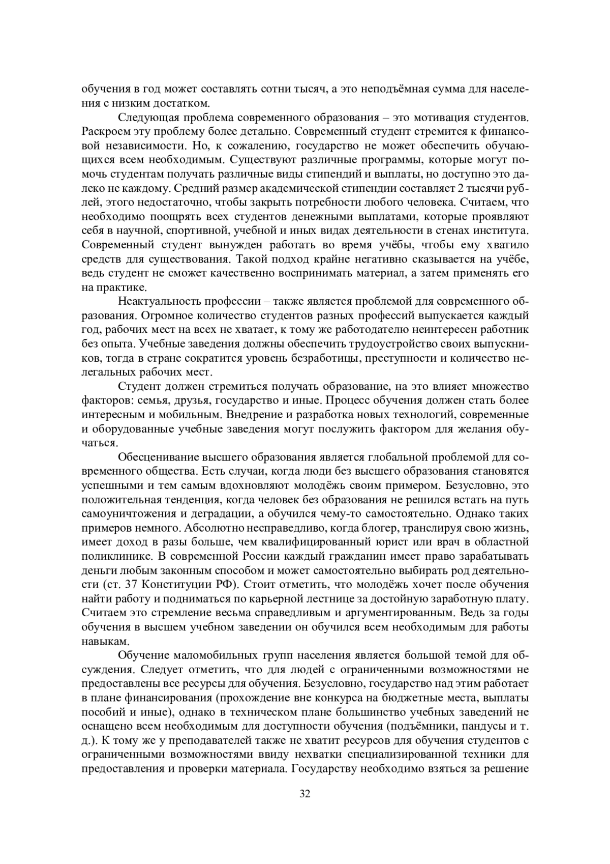 1. Богданова, А. Д. Современные проблемы высшего образования в России / А. Д. Богданова // Экономика и управление в сфере услуг: современное состояние и перспективы развития: Материалы XXI Всероссийской научно-практической конференции, Санкт-Петербург, 06февраля 2024 года. - СПб.: Санкт-Петербургский Гуманитарный университет профсоюзов, 2024. - С. 104-106. EDN: VGZOUI