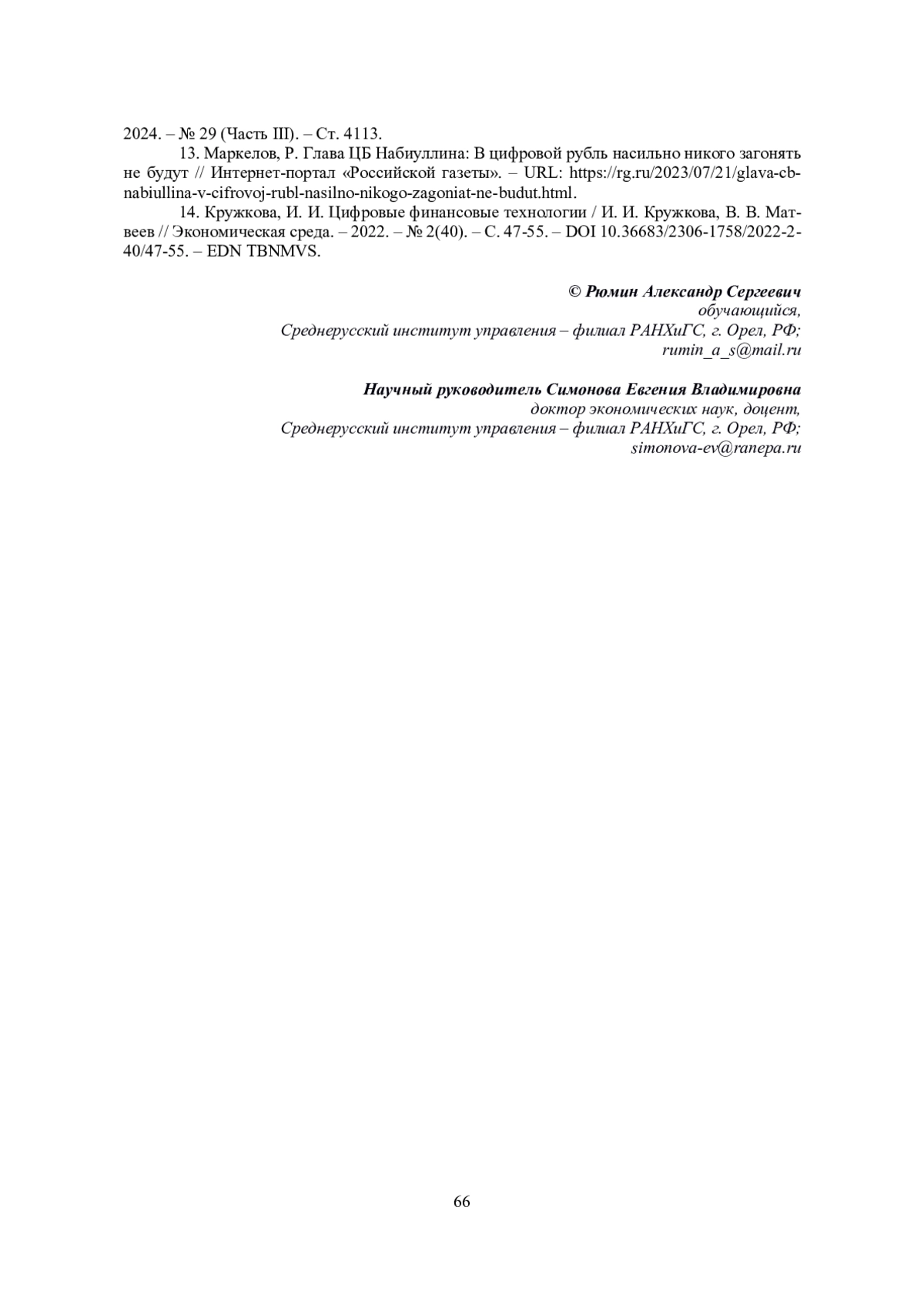 13. Маркелов, Р. Глава ЦБ Набиуллина: В цифровой рубль насильно никого загонять не будут // Интернет-портал “Российской газеты”. - URL: https://rg.ru/2023/07/21/glava-cb-nabiullina-v-cifrovoj-rubl-nasilno-nikogo-zagoniat-ne-budut.html.