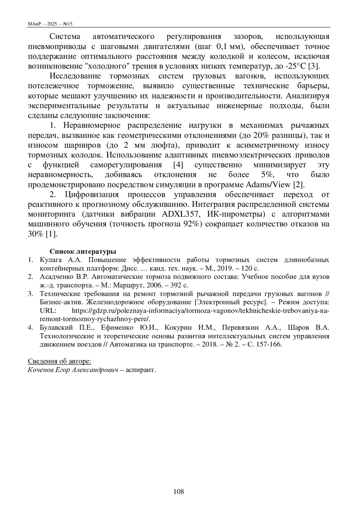 1. Кулага А.А. Повышение эффективности работы тормозных систем длиннобазных контейнерных платформ: Дисс. … канд. тех. наук. – М., 2019. – 120 с.