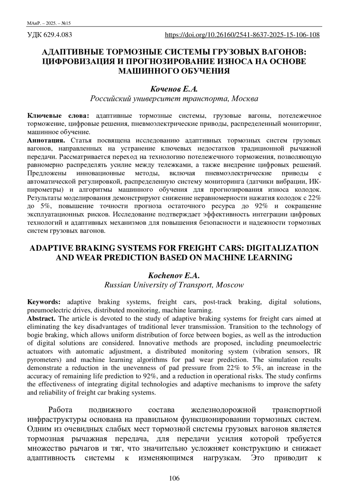 Статья посвящена исследованию адаптивных тормозных систем грузовых вагонов, направленных на устранение ключевых недостатков традиционной рычажной передачи. Рассматривается переход на технологию потележечного торможения, позволяющую равномерно распределять усилие между тележками, а также внедрение цифровых решений. Предложены инновационные методы, включая пневмоэлектрические приводы с автоматической регулировкой, распределенную систему мониторинга (датчики вибрации, ИКпирометры) и алгоритмы машинного обучения для прогнозирования износа колодок. Результаты моделирования демонстрируют снижение неравномерности нажатия колодок с 22% до 5%, повышение точности прогноза остаточного ресурса до 92% и сокращение эксплуатационных рисков. Исследование подтверждает эффективность интеграции цифровых технологий и адаптивных механизмов для повышения безопасности и надежности тормозных систем грузовых вагонов.