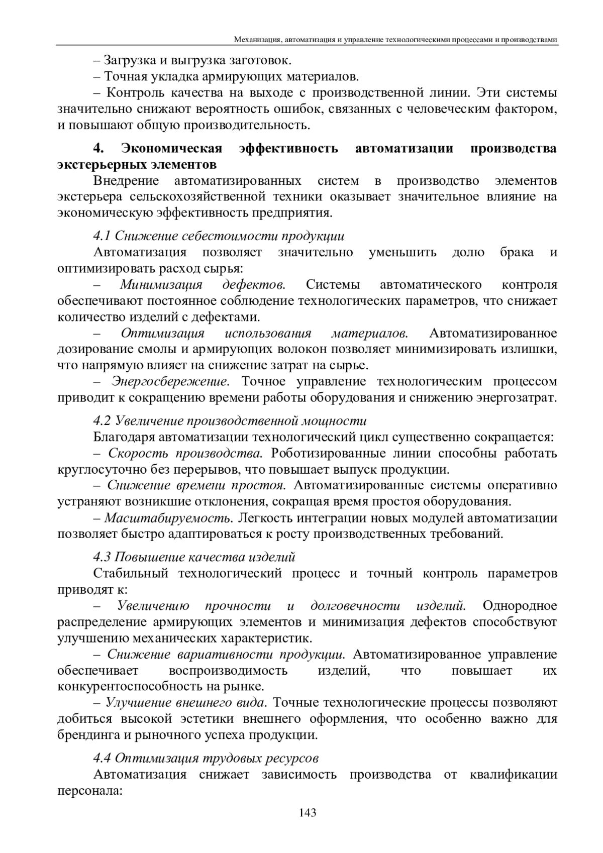 В статье рассматриваются современные методы автоматизации производства элементов экстерьера сельскохозяйственной техники с использованием полимерных композитов. Описаны ключевые технологические процессы, такие как вакуумная формовка, контактное формование и RTM-инфузия, применяемые для изготовления внешних элементов конструкций. Особое внимание уделяется системам автоматического контроля, позволяющим оптимизировать процесс, снизить производственные затраты и повысить качество изделий. Практическая значимость работы заключается в демонстрации эффективности интеграции автоматизированных решений в производство экстерьерных деталей сельскохозяйственной техники, что способствует повышению конкурентоспособности продукции на современном рынке.