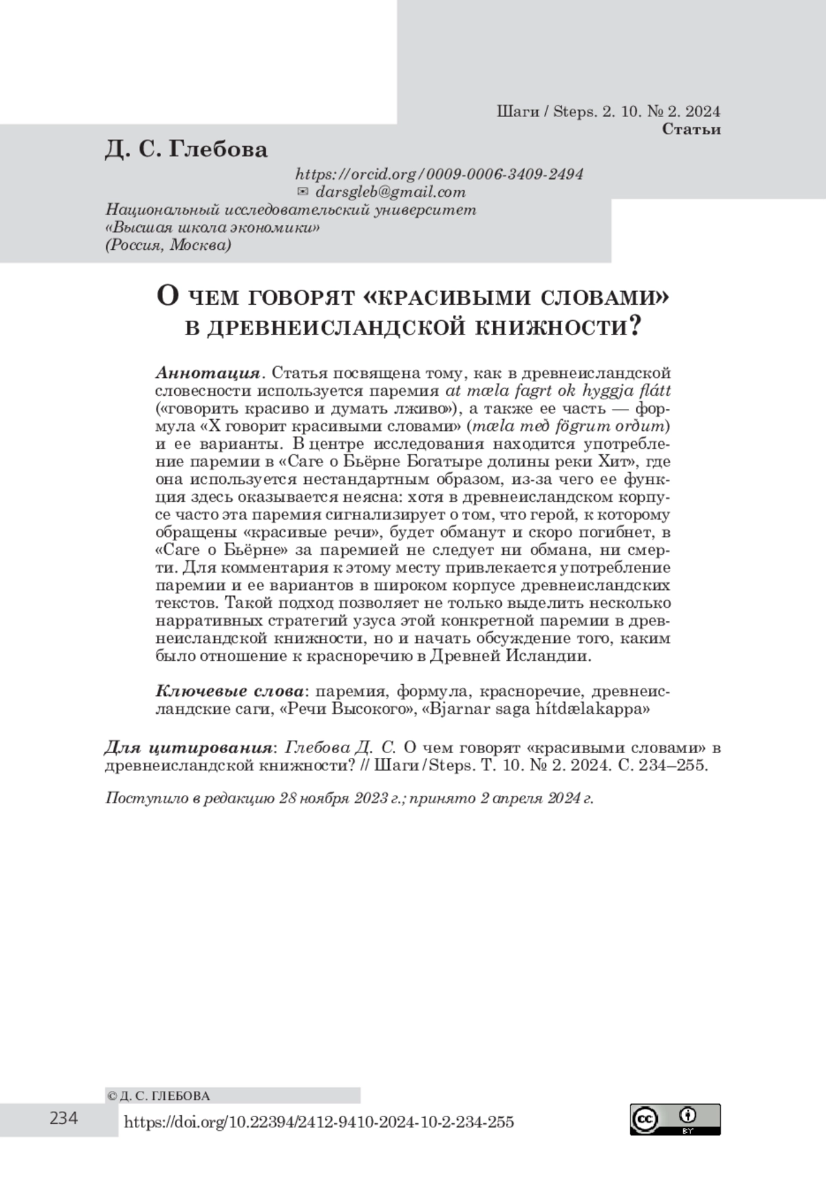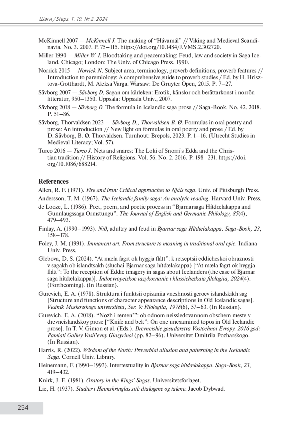 1. Глебова 2024 - Глебова Д. С. «At mæla fagrt ok hyggja flátt»: к рецепции эддической образности в сагах об исландцах (случай Bjarnar saga hítdælakappa) // Индоевропейское языкознание и классическая филология. 2024. № 4. (В печати).