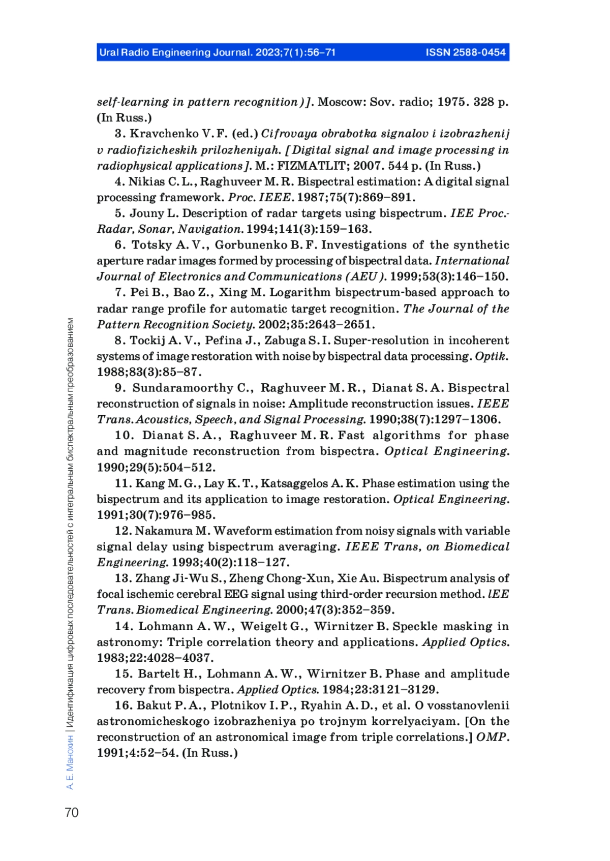 7. Pei B., Bao Z., Xing M. Logarithm bispectrum-based approach to radar range profile for automatic target recognition. The Journal of the Pattern Recognition Society. 2002;35:2643-2651. EDN: BDLTPZ