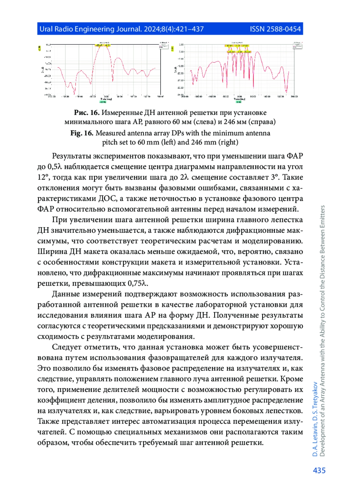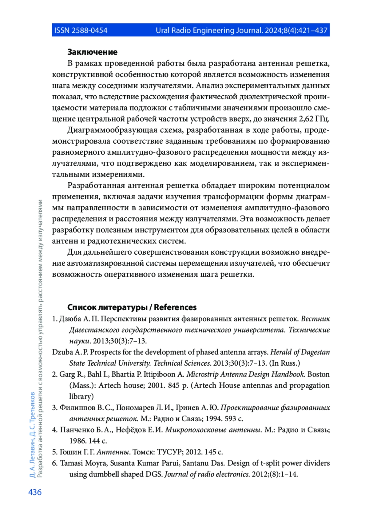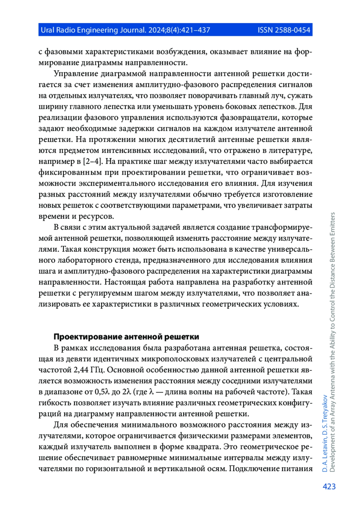 В работе представлена антенная решетка с центральной рабочей частотой 2,44 ГГц, обладающая возможностью изменения расстояния между излучателями от 0,5λ до 2λ (где λ - длина волны на рабочей частоте) для исследования влияния пространственного распределения на форму диаграммы направленности (ДН). Антенная решетка содержит девять излучателей, каждый из которых реализован на отдельной плате, а изменение расстояния между излучателями реализовано с помощью нескольких направляющих. Такая конструкция обладает потенциалом для применения в качестве универсального лабораторного стенда, предназначенного для изучения влияния шага между излучателями на характеристики диаграммы направленности антенной решетки. Для повышения функциональности конструкции предлагается интеграция автоматизированной системы перемещения излучателей. Это обеспечит возможность быстрого и точного изменения шага антенной решетки, что расширит возможности исследований и улучшит гибкость настройки устройства.