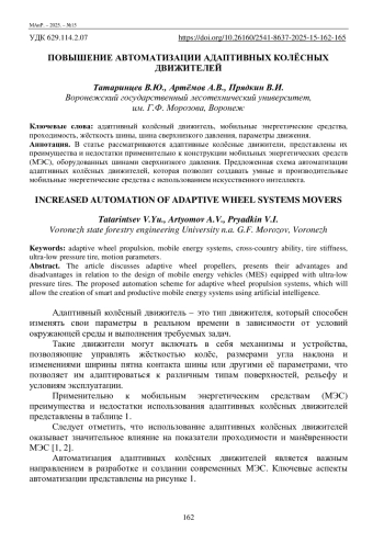 2. Татаринцев В.Ю., Артемов А.В., Снятков Е.В., Прядкин В.И. Повышение адаптивности колёсных движителей на мобильных средствах: проблемы и пути решения // Перспективные направления развития автомобильной отрасли и подготовка кадров: Материалы Всероссийской научной конференции. – Воронеж: Воронежский государственный лесотехнический университет им. Г.Ф. Морозова, 2024. – С. 150-160.