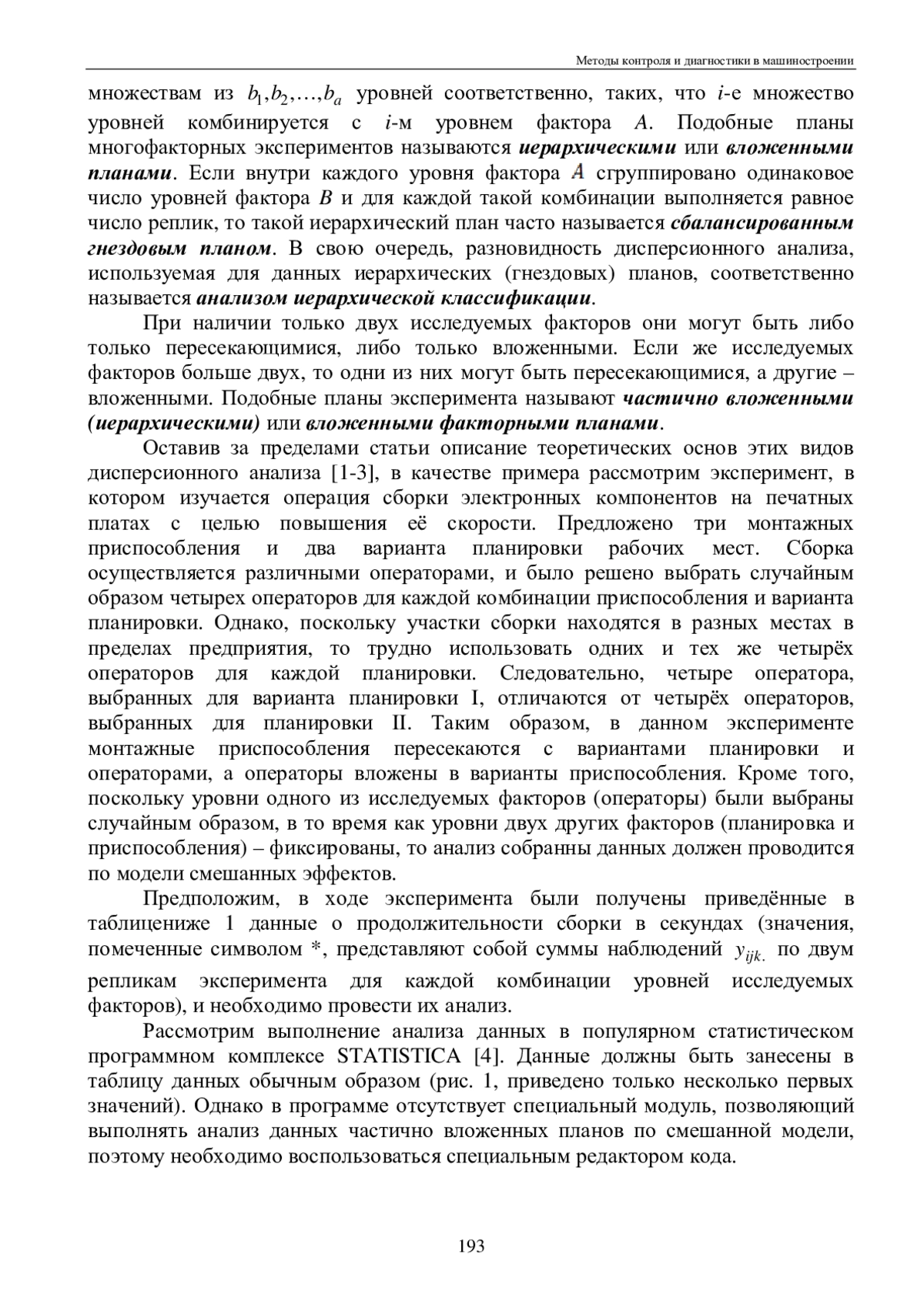 Во многих практических ситуациях контроля качества приходится исследовать влияние на отклик двух и более факторов. С этой целью могут использоваться соответствующие процедуры дисперсионного анализа, при этом предполагается, как правило, что данные получены в ходе проведения экспериментов по факторным планам. При использовании таких планов в каждом полном опыте или реплике эксперимента исследуются все возможные комбинации уровней (обработок) факторов. При этом, если каждый уровень одного фактора комбинируется с каждым уровнем другого фактора, то такие факторы называются пересекающимися, а соответствующий дисперсионный анализ – анализом перекрёстной классификации.