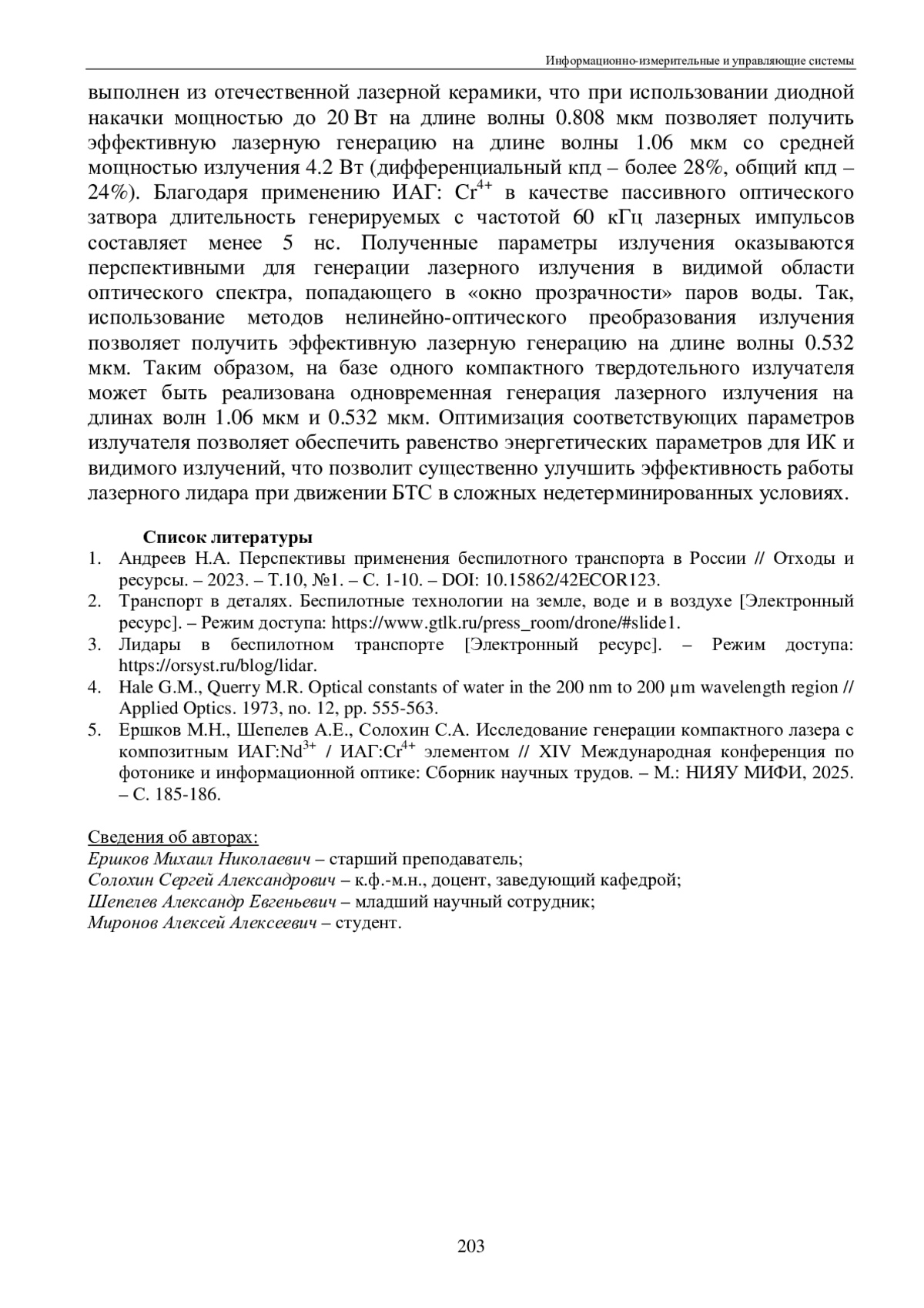 5. Ершков М.Н., Шепелев А.Е., Солохин С.А. Исследование генерации компактного лазера с композитным ИАГ:Nd3+ / ИАГ:Cr4+ элементом // XIV Международная конференция по фотонике и информационной оптике: Сборник научных трудов. – М.: НИЯУ МИФИ, 2025. – С. 185-186.