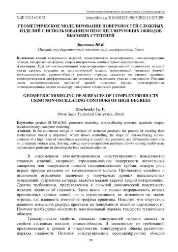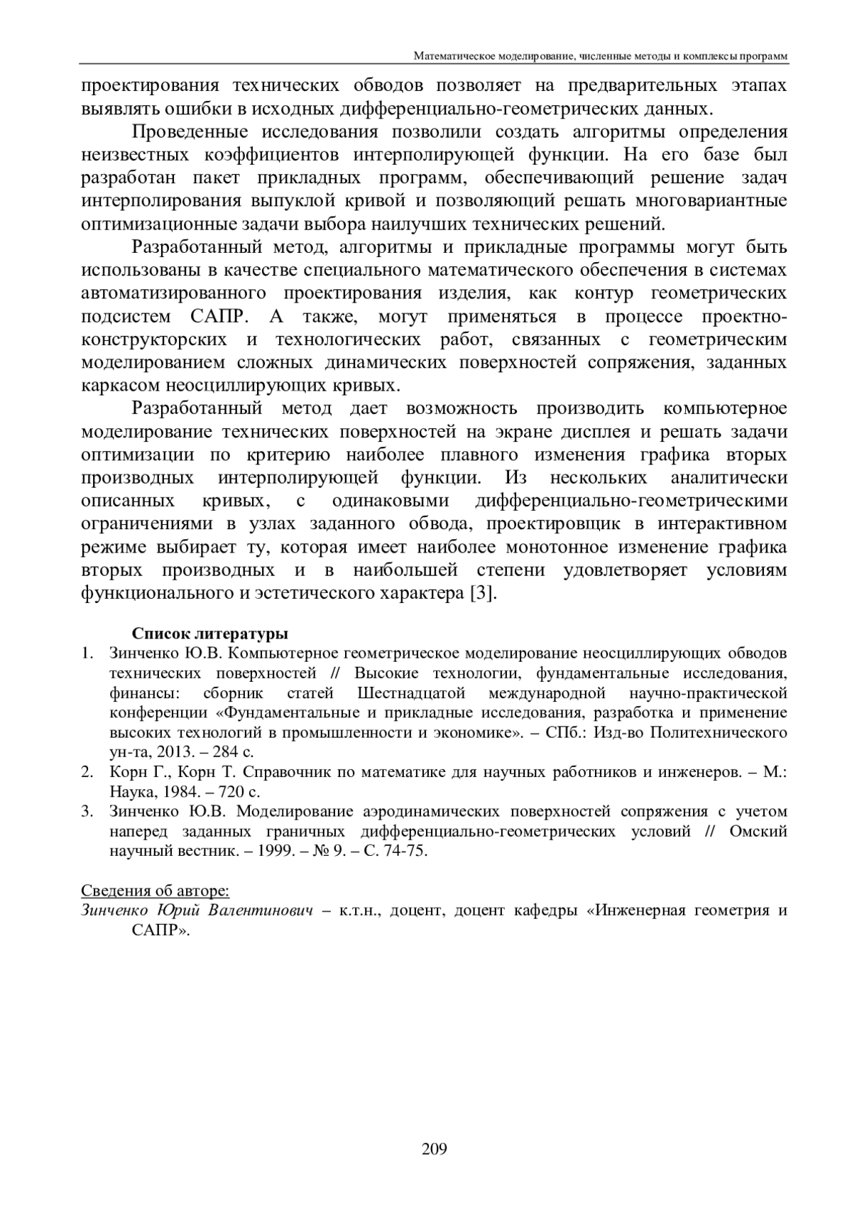 3. Зинченко Ю.В. Моделирование аэродинамических поверхностей сопряжения с учетом наперед заданных граничных дифференциально-геометрических условий // Омский научный вестник. – 1999. – № 9. – С. 74-75.