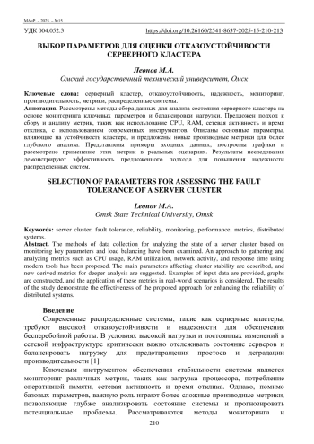 Рассмотрены методы сбора данных для анализа состояния серверного кластера на основе мониторинга ключевых параметров и балансировки нагрузки. Предложен подход к сбору и анализу метрик, таких как использование CPU, RAM, сетевая активность и время отклика, с использованием современных инструментов. Описаны основные параметры, влияющие на устойчивость кластера, и предложены новые производные метрики для более глубокого анализа. Представлены примеры входных данных, построены графики и рассмотрено применение этих метрик в реальных сценариях. Результаты исследования демонстрируют эффективность предложенного подхода для повышения надежности распределенных систем.