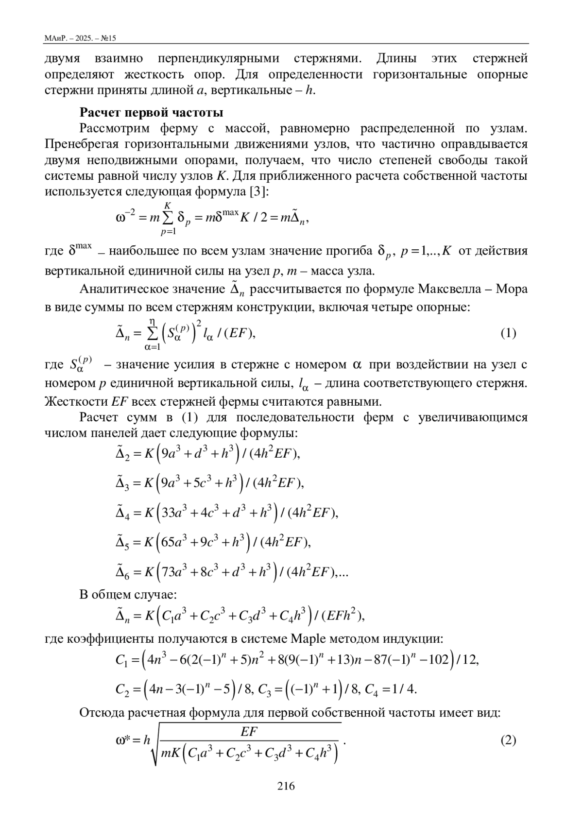Определение собственных частот колебаний строительных конструкций является одной из основных задач строительной механики. Особенностям аналитического расчета на примере плоской фермы посвящена настоящая работа. Методы оптимизации ферм с ограничениями на частоты собственных колебаний разработаны в [1]. Аналитические решения для элементов строительных конструкций с использования метода начальных функций с привлечением системы компьютерной математики получены в [2]. Рассматривается статически определимая ферма с подъемом средней ее части и с двумя неподвижными шарнирными опорами. Определяется приближенное аналитическое выражение для первой частоты собственных колебаний.