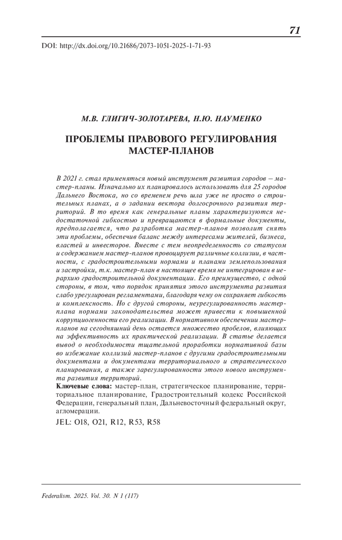 В 2021 г. стал применяться новый инструмент развития городов – мастер-планы. Изначально их планировалось использовать для 25 городов Дальнего Востока, но со временем речь шла уже не просто о строительных планах, а о задании вектора долгосрочного развития территорий. В то время как генеральные планы характеризуются не - достаточной гибкостью и превращаются в формальные документы, предполагается, что разработка мастер-планов позволит снять эти проблемы, обеспечив баланс между интересами жителей, бизнеса, властей и инвесторов. Вместе с тем неопределенность со статусом и содержанием мастер-планов провоцирует различные коллизии, в частности, с градостроительными нормами и планами землепользования и застройки, т. к. мастер-план в настоящее время не интегрирован в иерархию градостроительной документации. Его преимущество, с одной стороны, в том, что порядок принятия этого инструмента развития слабо урегулирован регламентами, благодаря чему он сохраняет гибкость и комплексность. Но с другой стороны, неурегулированность мастер-плана нормами законодательства может привести к повышенной коррупциогенности его реализации. В нормативном обеспечении мастер-планов на сегодняшний день остается множество пробелов, влияющих на эффективность их практической реализации. В статье делается вывод о необходимости тщательной проработки нормативной базы во избежание коллизий мастер-планов с другими градостроительными документами и документами территориального и стратегического планирования, а также зарегулированности этого нового инструмента развития территорий.