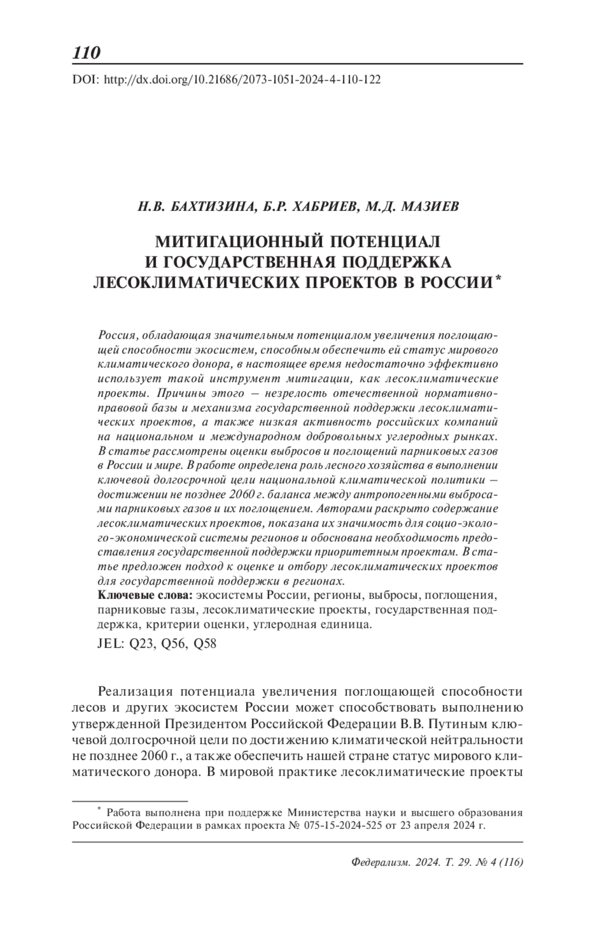 Россия, обладающая значительным потенциалом увеличения поглощаю - щей способности экосистем, способным обеспечить ей статус мирового климатического донора, в настоящее время недостаточно эффективно использует такой инструмент митигации, как лесоклиматические проекты. Причины этого – незрелость отечественной нормативноправовой базы и механизма государственной поддержки лесоклиматических проектов, а также низкая активность российских компаний на национальном и международном добровольных углеродных рынках. В статье рассмотрены оценки выбросов и поглощений парниковых газов в России и мире. В работе определена роль лесного хозяйства в выполнении ключевой долгосрочной цели национальной климатической политики – достижении не позднее 2060 г. баланса между антропогенными выбросами парниковых газов и их поглощением. Авторами раскрыто содержание лесоклиматических проектов, показана их значимость для социо-эколого-экономической системы регионов и обоснована необходимость предо - ставления государственной поддержки приоритетным проектам. В статье предложен подход к оценке и отбору лесоклиматических проектов для государственной поддержки в регионах.