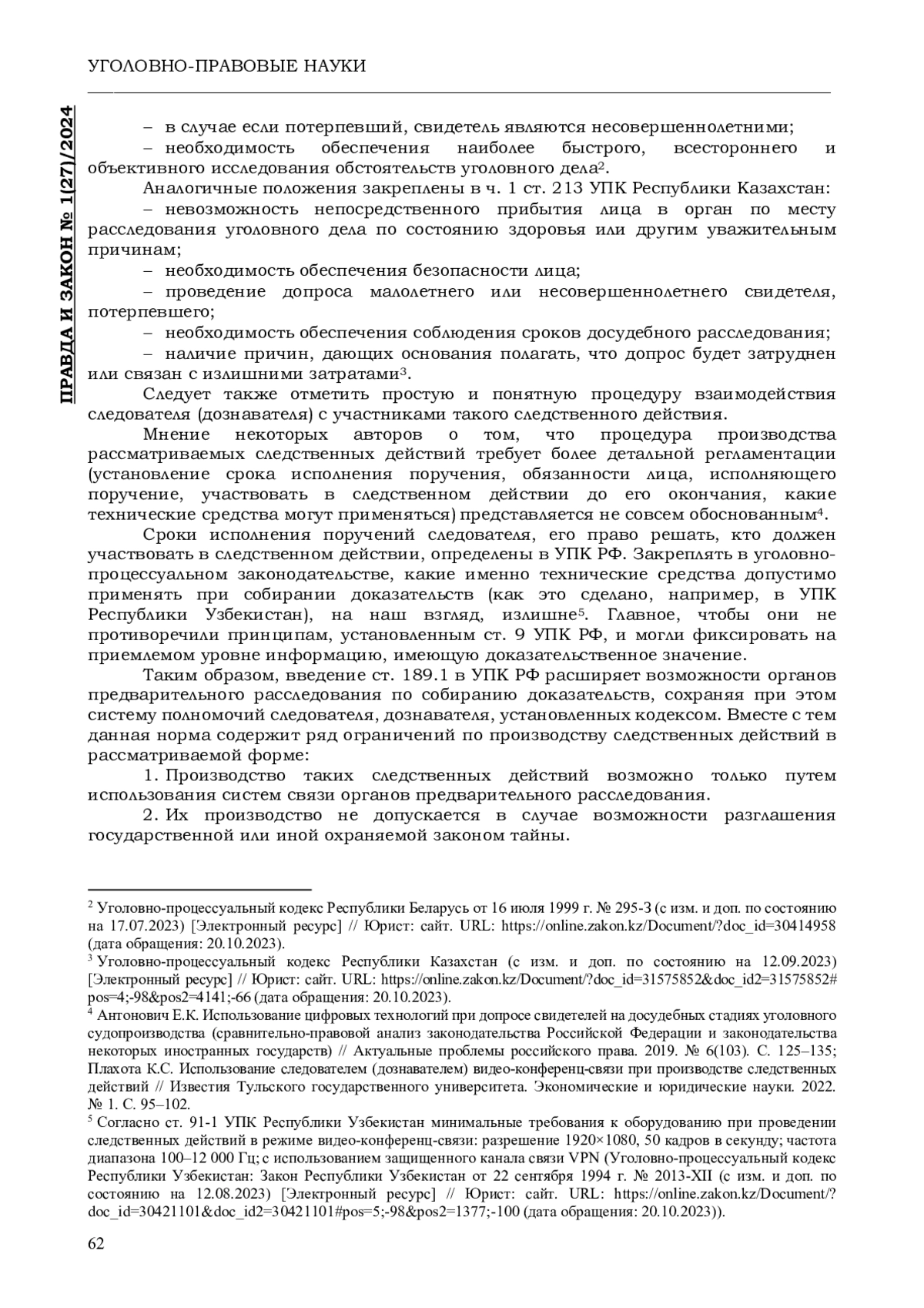 1. Антонович Е.К. Использование цифровых технологий при допросе свидетелей на досудебных стадиях уголовного судопроизводства (сравнительно-правовой анализ законодательства Российской Федерации и законодательства некоторых иностранных государств) // Актуальные проблемы российского права. 2019. № 6(103). С. 125-135. EDN: EUEMRP