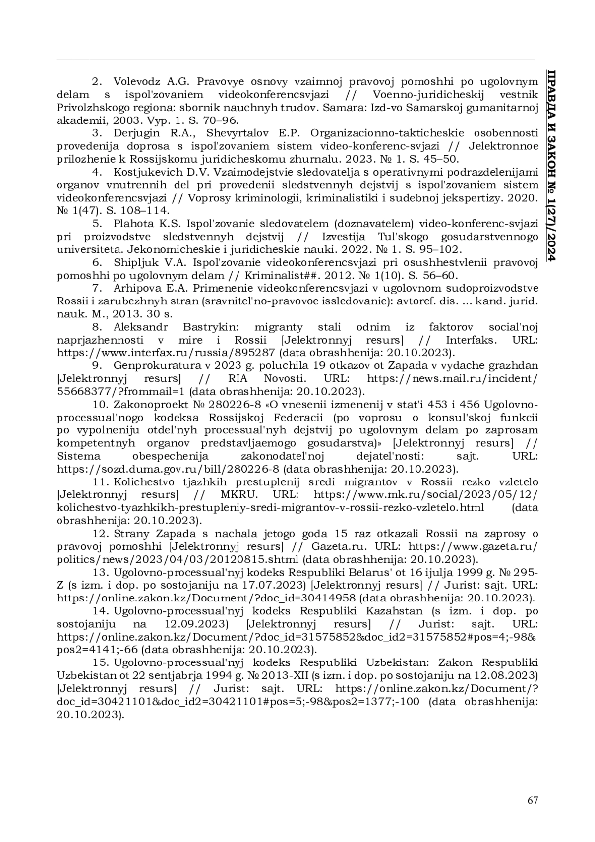 2. Волеводз А.Г. Правовые основы взаимной правовой помощи по уголовным делам с использованием видеоконференцсвязи // Военно-юридический вестник Приволжского региона: сборник научных трудов. Самара: Изд-во Самарской гуманитарной академии, 2003. Вып. 1. С. 70-96. EDN: UAKGSP