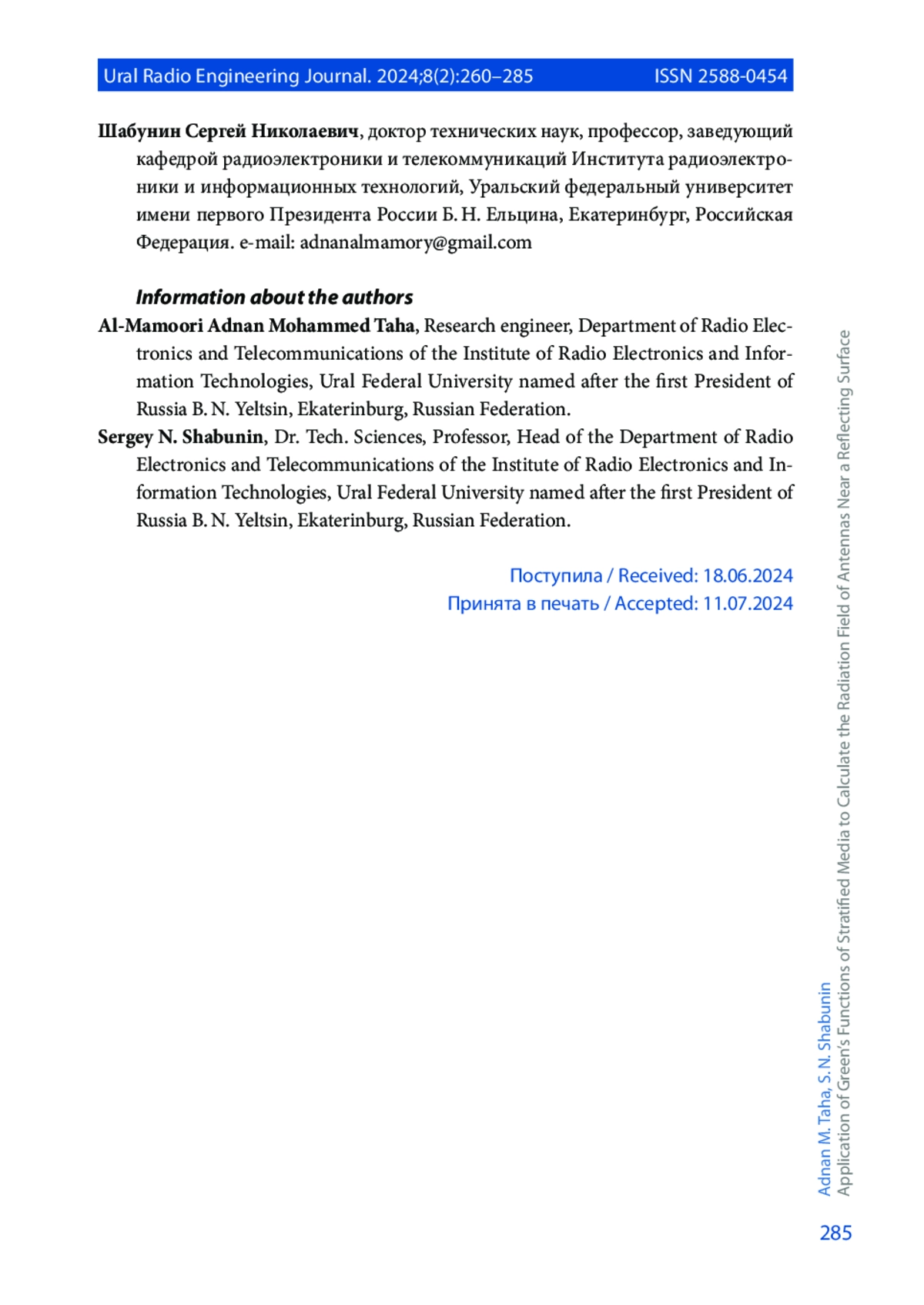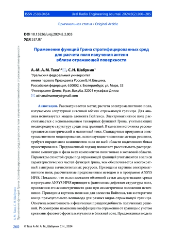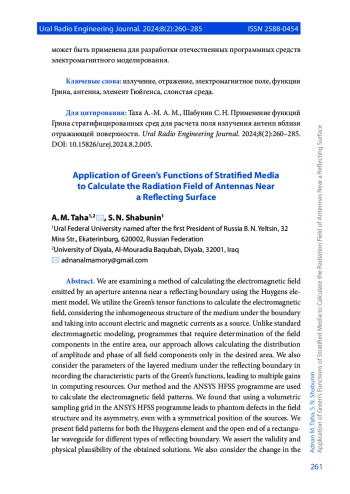 Рассматривается метод расчета электромагнитного поля, излучаемого апертурной антенной вблизи отражающей границы. Для анализа используется модель элемента Гюйгенса. Электромагнитное поле рассчитывается с использованием тензорных функций Грина, учитывающих неоднородную структуру среды под границей. В качестве источника рассматриваются электрический и магнитный токи. Стандартные программы электромагнитного моделирования, использующие численные методы решения, требуют определения компонентов поля во всей области выделенного бокса проектирования. Предложенный подход позволяет рассчитывать распределение амплитуды и фазы всех компонентов поля только в желаемой области. Параметры слоистой среды под отражающей границей учитываются в записи характеристических частей функций Грина, чем обеспечивается многократный выигрыш вычислительных ресурсов. Приведены картины электромагнитного поля, рассчитанные предложенным методом и в программе ANSYS HFSS. Показано, что использование объемной сетки дискретизации среды в программе ANSYS HFSS приводит к фантомным дефектам структуры поля, проявлению его асимметричности даже при симметричном положении источников. Приведены картины поля как для элемента Гюйгенса, так и открытого конца прямоугольного волновода для разных видов отражающей границы. Отмечена монотонность и физическая правдоподобность полученных решений. Рассмотрено изменение коэффициента отражения от границы с учетом кривизны фазового фронта излучателя в ближней зоне. Предложенная модель может быть применена для разработки отечественных программных средств электромагнитного моделирования.