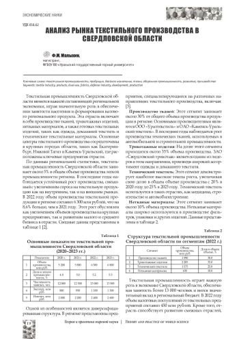 Свердловская область, являясь одним из наиболее развитых промышленных регионов России, имеет уникальные особенности в развитии текстильного производства. Благодаря выгодному географическому положению, наличию квалифицированных кадров и развитой инфраструктуре, регион обладает значительным потенциалом для роста текстильной отрасли. Однако, как и многие другие регионы, Свердловская область сталкивается с рядом проблем, включая высокую конкуренцию со стороны импортной продукции, зависимость от импортного сырья и недостаток инвестиций в модернизацию производства. Целью данной статьи является проведение комплексного анализа рынка текстильного производства в Свердловской области, выявление ключевых тенденций, проблем и перспектив развития отрасли. В работе рассматриваются основные показатели текстильной промышленности, анализируется деятельность крупнейших предприятий региона, а также оценивается влияние внешних и внутренних факторов на развитие отрасли. Особое внимание уделяется таким аспектам, как внедрение инновационных технологий, развитие экспортного потенциала и экологическая устойчивость производства.