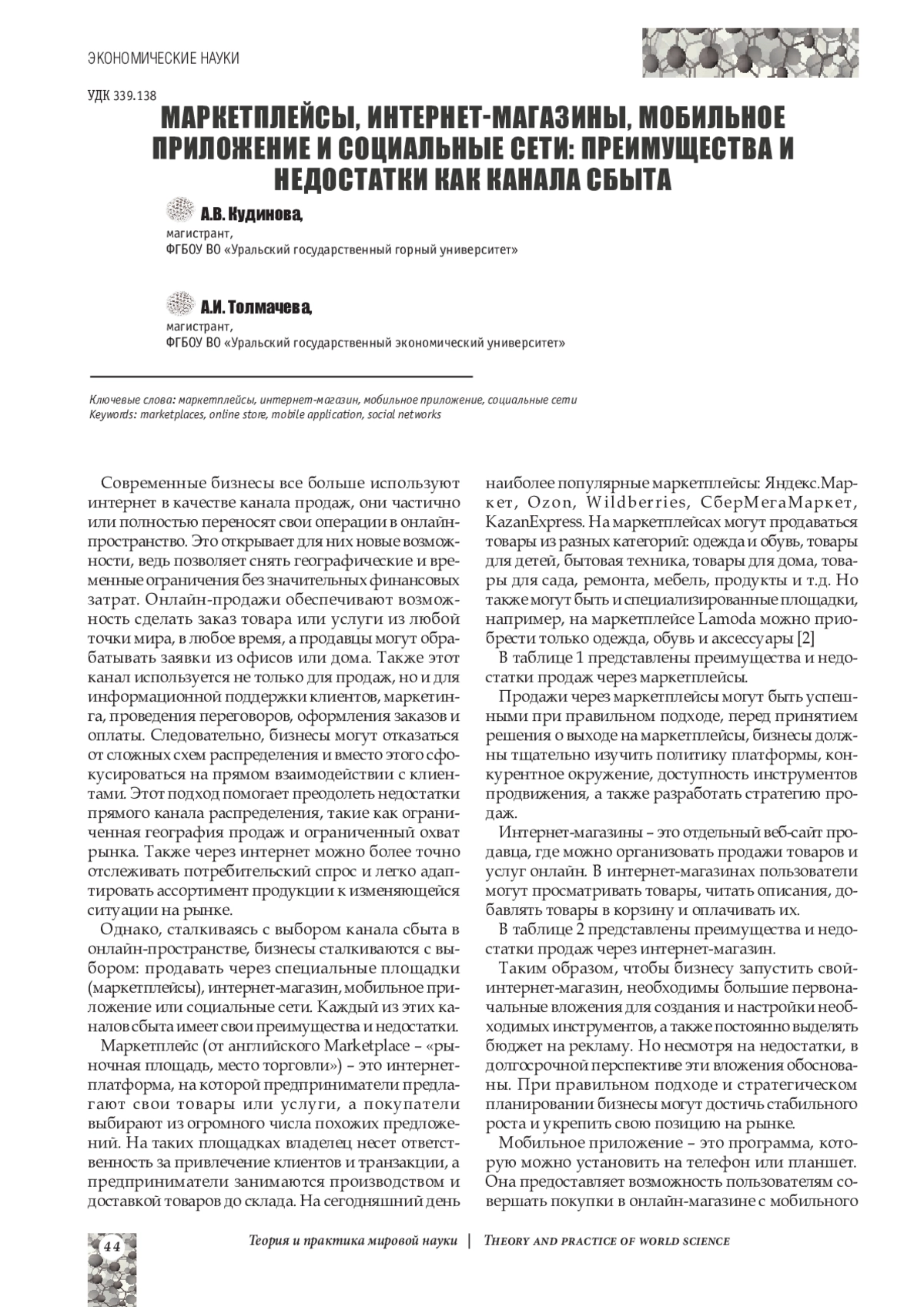 2. Марченков А.А. Маркетплейсы как главный тренд электронной коммерции / А.А. Марченков // Научные стремления. - 2020. - № 26. - С. 65-67.