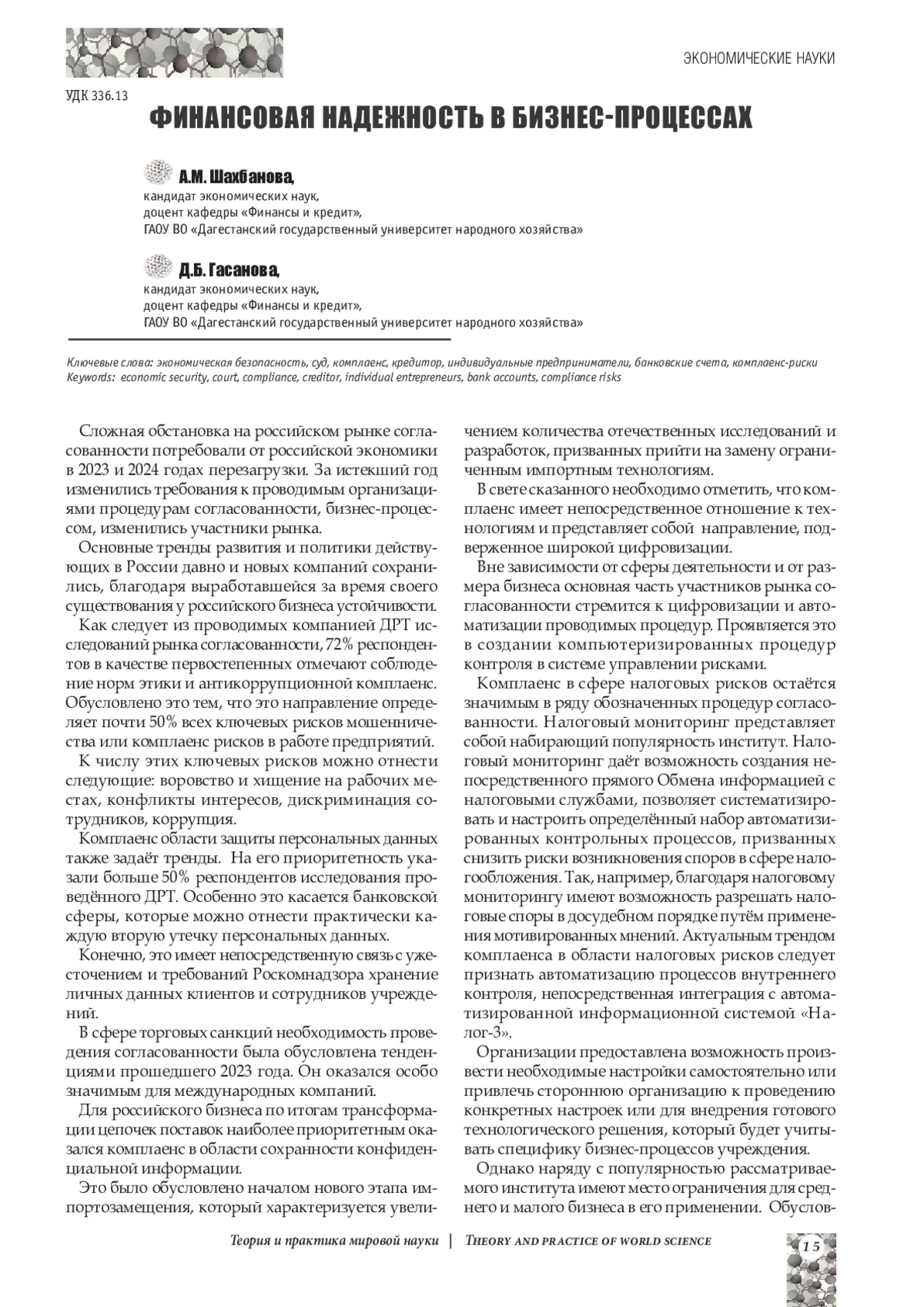 В статье рассматривается примерная ситуация финансовой надежности и согласованности в бизнес-процессах. Согласованность в бизнес-процессах предложено понимать как составной элемент контроля или управление в организации, который имеет непосредственную связь с риском несоответствия, несоблюдения требований нормативных документов, законодательства, кодексов поведения, стандартов и правил органов надзора, саморегулируемых организаций и отраслевых ассоциаций и так далее. В конечном итоге комплаенс-риски могут быть выражены в форме финансовых или репутационных потерь, санкции регулирующих органов, юридических санкций как итог несоответствия российским законам, стандартом и правилам области согласованности. Особое внимание в статье уделено автоматизации процесса выявления рисков.