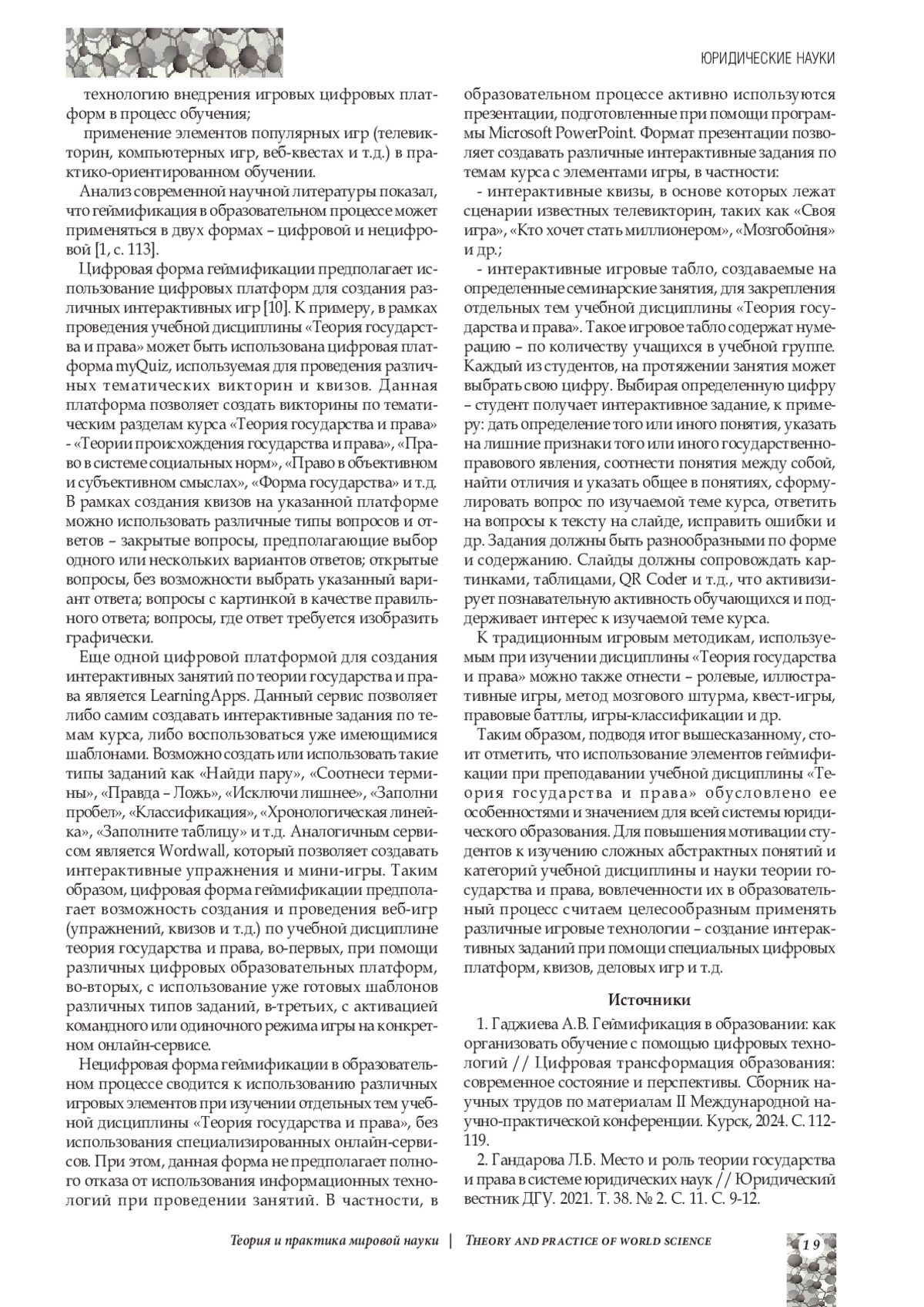 2. Гандарова Л.Б. Место и роль теории государства и права в системе юридических наук // Юридический вестник ДГУ. 2021. Т. 38. № 2. С. 11. С. 9-12. EDN: UFOKNZ