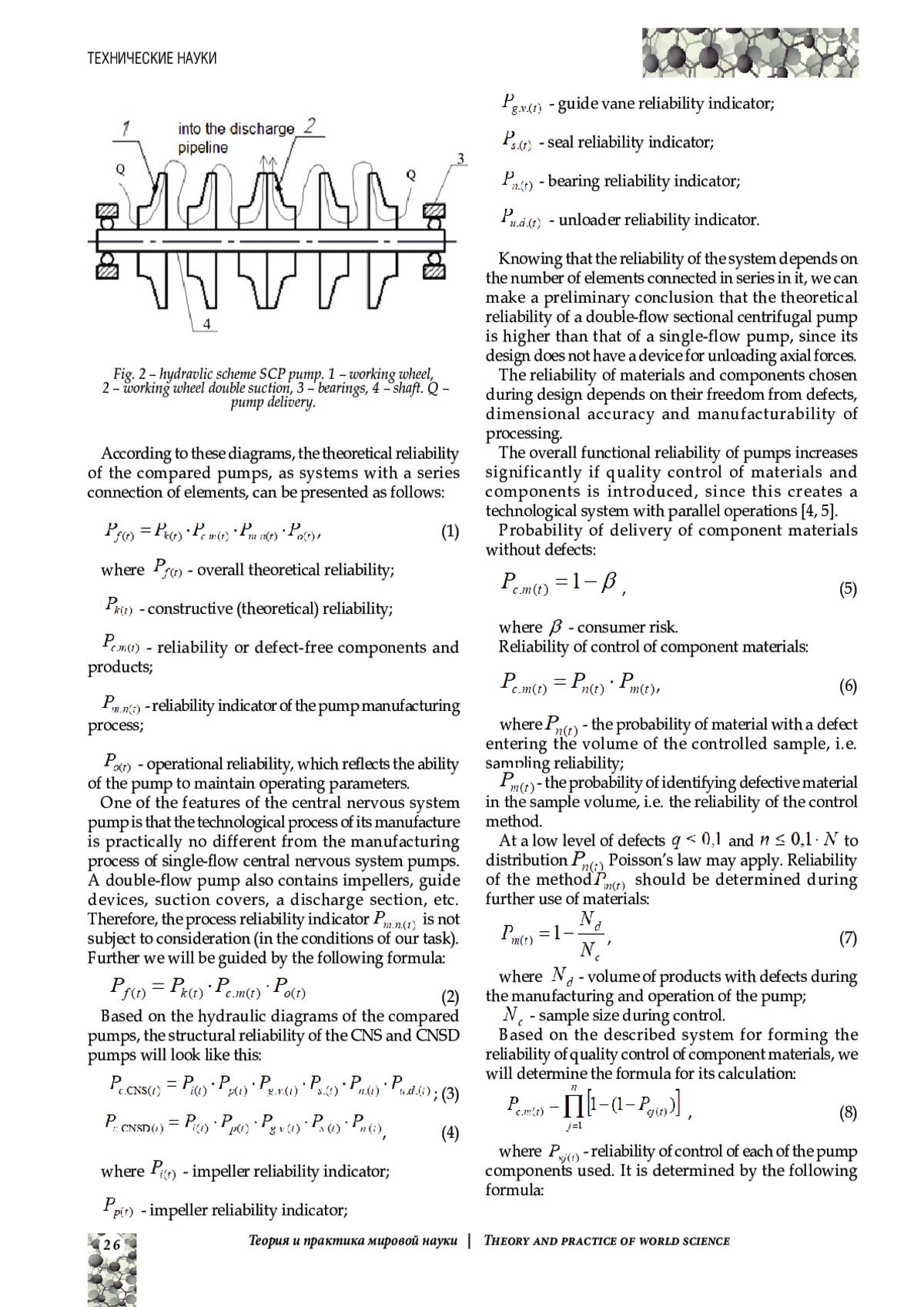 1 УГГУ Объектами, рассматриваемыми в статье, являются шахтные секционные центробежные насосы. Дана сравнительная оценка функциональной надежности однопоточных насосов типа ЦНС и разрабатываемых в настоящее время двухпоточных насосов типа ЦНСД. На основе гидравлических схем и условий эксплуатации получены зависимости теоретической, конструктивной, технологической и эксплуатационной надежности насосов. Теоретическая или функциональная надежность представлена как надежность последовательно соединенных элементов: надежность конструкции, надежность материалов комплектующих, надежность процесса изготовления насоса, эксплуатационная надежность. В расчет конструктивной надежности включены показатели надежности основных элементов насосов, таких как: вал, рабочие колеса, уплотнения, направляющие аппараты, разгрузочное устройство. На основании формулы конструктивной надежности сделан предварительный вывод, что теоретическая надежность двухпоточного секционного центробежного насоса выше, чем у однопоточного насоса, поскольку в его конструкции отсутствует устройство для разгрузки осевых усилий.