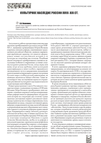 Цель исследования заключается в проведении комплексного анализа культурного наследия России XVIII-XIX ст. Задачами работы становится выявление особенностей ментальности русского общества, вызванных реформами Петра Первого, повлекших эволюцию архитектуры, живописи, литературы в XVIII-XIX вв. Теоретико-методологическим фундаментом статьи послужил анализ и синтез культурного наследия этой эпохи, дающих представление об архитектуре, живописи, литературе Российского государства. Выявлены особенности стилеобразования в жанрах русской культуры, продемонстрировавших общее с европейской и особенное, связанное с чисто российской ментальностью, повлиявшее на творчество русских художников девятнадцатого века. Исследовано творчество европейских и русских зодчих и живописцев, создававших свои произведения в России XVIII-XIX вв. Определена актуальность сохранения всего многообразия культурного наследия в России для актуализации знаний и чувств патриотизма в российском обществе.