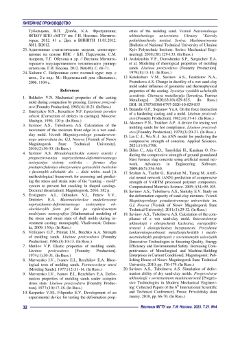 7. Мутилов В.П. Упругие свойства формовочной смеси // Литейное производство. 1974. №1. С. 30-31.