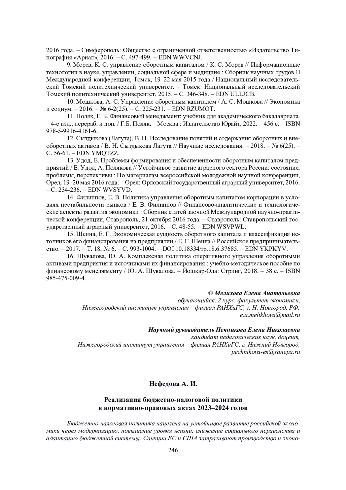 1. Ефимова, А. В. Некоторые вопросы современной налоговой политики России / А. В. Ефимова, Е. Н. Машнова, О. В. Заводило // Стратегия социально-экономического развития общества: управленческие, правовые, хозяйственные аспекты: сборник научных статей 12-й Международной научно-практической конференции, Курск, 17-18 ноября 2022 года. - Курск: Юго-Западный государственный университет, 2022. - С. 148-152. EDN: LUCHBW