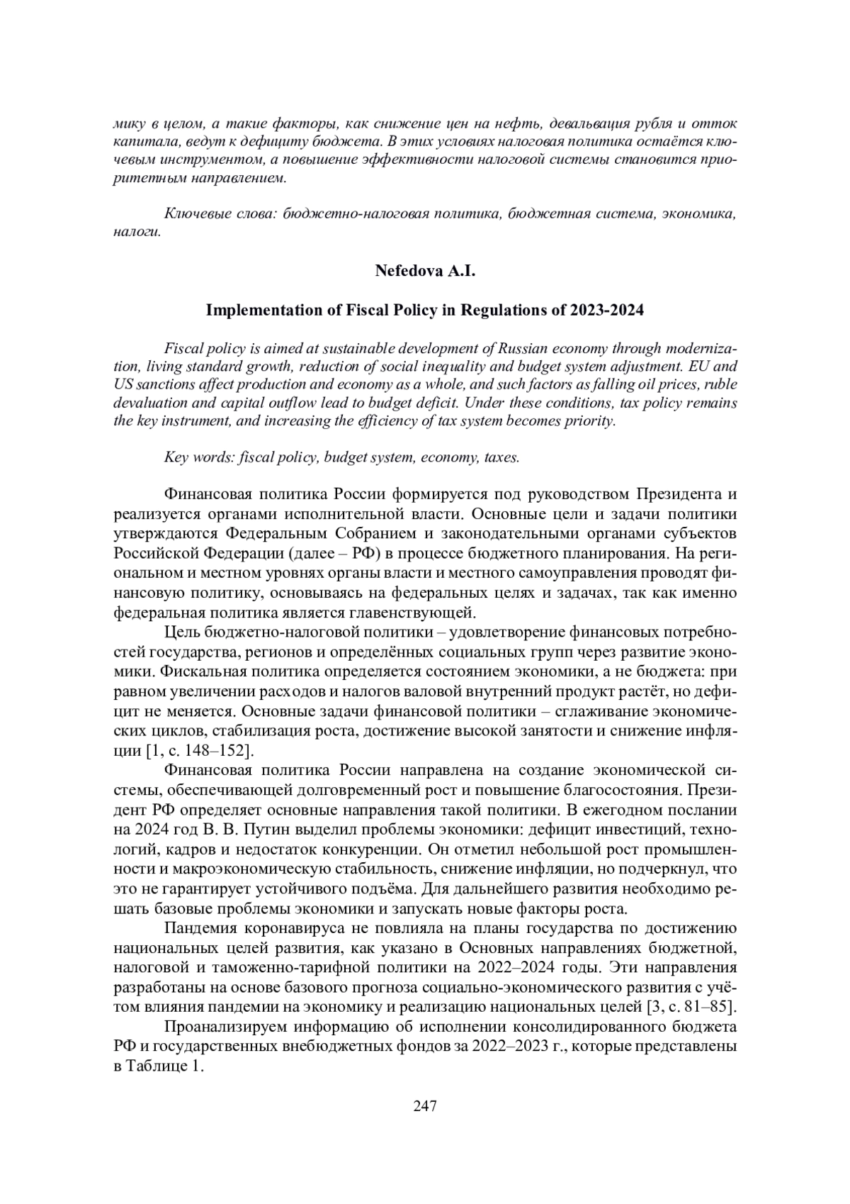 Бюджетно-налоговая политика нацелена на устойчивое развитие российской экономики через модернизацию, повышение уровня жизни, снижение социального неравенства и адаптацию бюджетной системы. Санкции ЕС и США затрагивают производство и эконо-мику в целом, а такие факторы, как снижение цен на нефть, девальвация рубля и отток капитала, ведут к дефициту бюджета. В этих условиях налоговая политика остаётся ключевым инструментом, а повышение эффективности налоговой системы становится приоритетным направлением.
