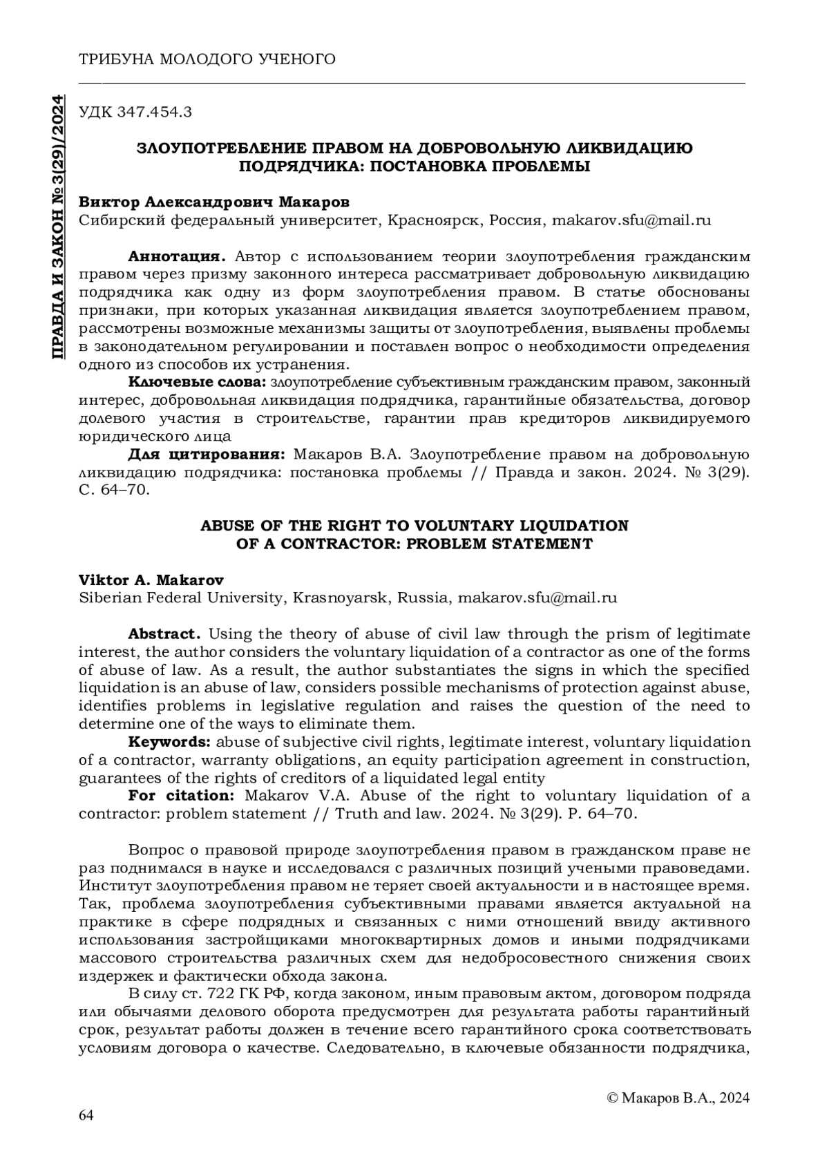 Автор с использованием теории злоупотребления гражданским правом через призму законного интереса рассматривает добровольную ликвидацию подрядчика как одну из форм злоупотребления правом. В статье обоснованы признаки, при которых указанная ликвидация является злоупотреблением правом, рассмотрены возможные механизмы защиты от злоупотребления, выявлены проблемы в законодательном регулировании и поставлен вопрос о необходимости определения одного из способов их устранения.