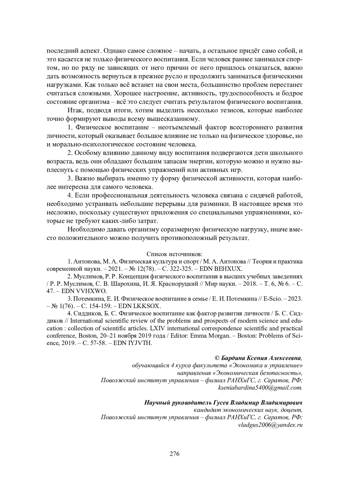 4. Сиддиков, Б. С. Физическое воспитание как фактор развития личности / Б. С. Сиддиков // International scientific review of the problems and prospects of modern science and education: collection of scientific articles. LXIV international correspondence scientific and practical conference, Boston, 20-21 ноября 2019 года / Editor: Emma Morgan. - Boston: Problems of Science, 2019. - С. 57-58. EDN: IYJVTH
