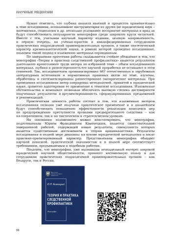 Исследование проблемы следственной профилактики для решения задач органов предварительного следствия в системе общегосударственной превенции криминальных деяний предполагает не только определение понятия, содержания и общих принципов организации следственной профилактики, но и разработку ключевых инструментов ее реализации на практике. Сказанное объясняет высокую степень актуальности темы монографии Ю. Ф. Каменецкого, своевременный выход которой привлек внимание не только ученых-специалистов в области уголовноправовых наук, но и широкой юридической научной общественности Беларуси и России.