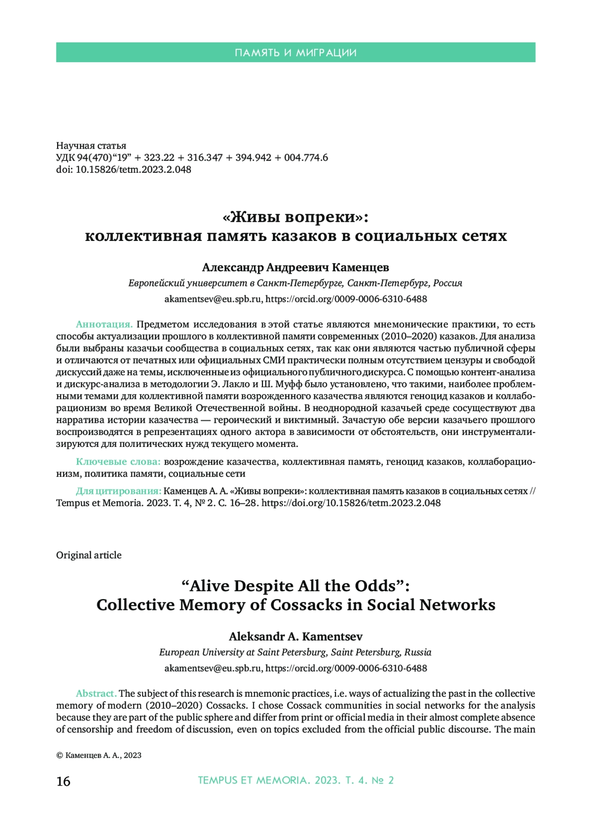 Предметом исследования в этой статье являются мнемонические практики, то есть способы актуализации прошлого в коллективной памяти современных (2010-2020) казаков. Для анализа были выбраны казачьи сообщества в социальных сетях, так как они являются частью публичной сферы и отличаются от печатных или официальных СМИ практически полным отсутствием цензуры и свободой дискуссий даже на темы, исключенные из официального публичного дискурса. С помощью контент-анализа и дискурс-анализа в методологии Э. Лакло и Ш. Муфф было установлено, что такими, наиболее проблемными темами для коллективной памяти возрожденного казачества являются геноцид казаков и коллаборационизм во время Великой Отечественной войны. В неоднородной казачьей среде сосуществуют два нарратива истории казачества - героический и виктимный. Зачастую обе версии казачьего прошлого воспроизводятся в репрезентациях одного актора в зависимости от обстоятельств, они инструментализируются для политических нужд текущего момента.