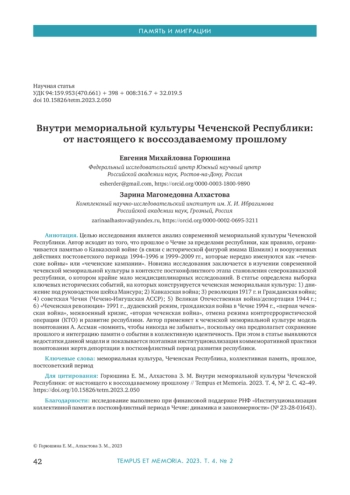 Целью исследования является анализ современной мемориальной культуры Чеченской Республики. Автор исходит из того, что прошлое о Чечне за пределами республики, как правило, ограничивается памятью о Кавказской войне (в связи с исторической фигурой имама Шамиля) и вооруженных действиях постсоветского периода 1994-1996 и 1999-2009 гг., которые нередко именуются как «чеченские войны» или «чеченские кампании». Новизна исследования заключается в изучении современной чеченской мемориальной культуры в контексте постконфликтного этапа становления северокавказской республики, о котором крайне мало междисциплинарных исследований. В статье определена выборка ключевых исторических событий, на которых конструируется чеченская мемориальная культура: 1) движение под руководством шейха Мансура; 2) Кавказская война; 3) революция 1917 г. и Гражданская война; 4) советская Чечня (Чечено-Ингушская АССР); 5) Великая Отечественная война/депортация 1944 г.; 6) «Чеченская революция» 1991 г., дудаевский режим, гражданская война в Чечне 1994 г., «первая чеченская война», межвоенный кризис, «вторая чеченская война», отмена режима контртеррористической операции (КТО) и развитие республики. Автор применяет к чеченской мемориальной культуре модель помятования А. Ассман «помнить, чтобы никогда не забывать», поскольку она предполагает сохранение прошлого и интеграцию памяти о событии в коллективную идентичность. При этом в статье выявляются недостатки данной модели и показывается поэтапная институционализация коммеморативной практики помятования жертв депортации в постконфликтный период развития республики.